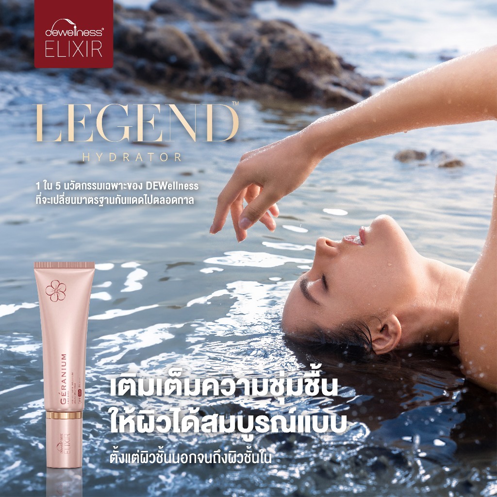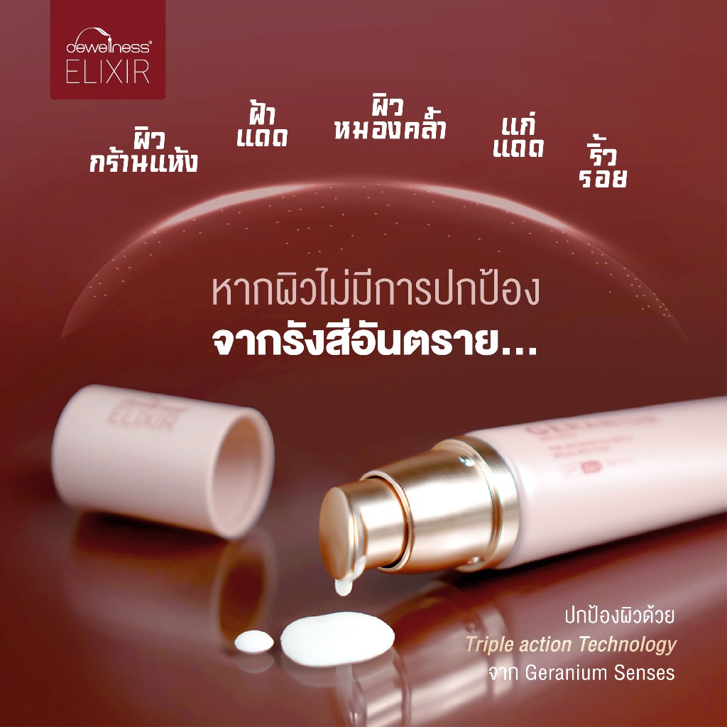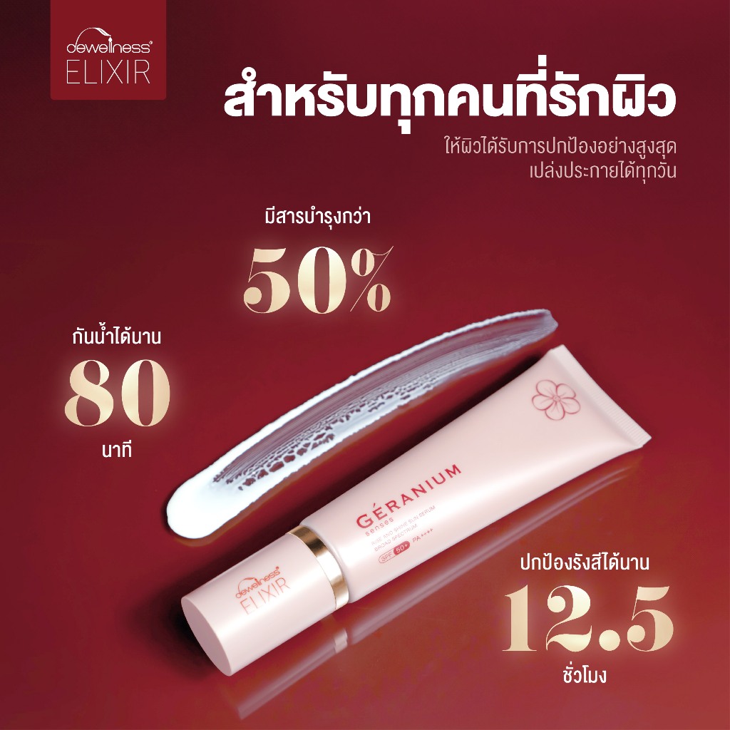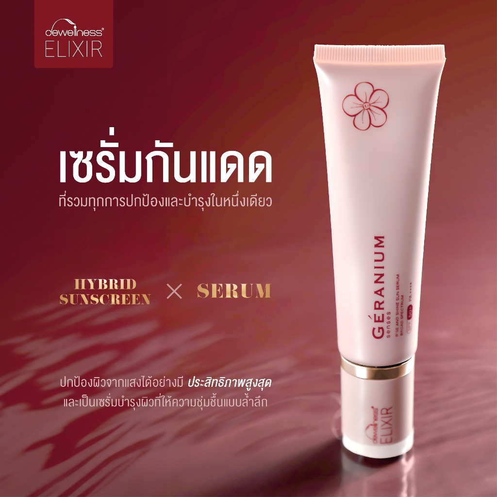 DEWellness Elixir Geranium Senses Rise and Shine Sun Serum Broad Spectrum SPF50+ PA++++ เจอราเนียม เซรั่มน้ำค้างกันแดด