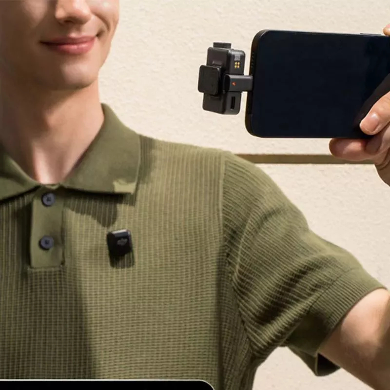 ตัวรับสัญญาณขนาดเล็กของไมค์ DJI ช่วยให้สามารถเชื่อมต่อกับอุปกรณ์มือถือ Apple ด้วยพอร์ต Lightning เพื่อบันทึกเสียงภาพรวมโดยรวม