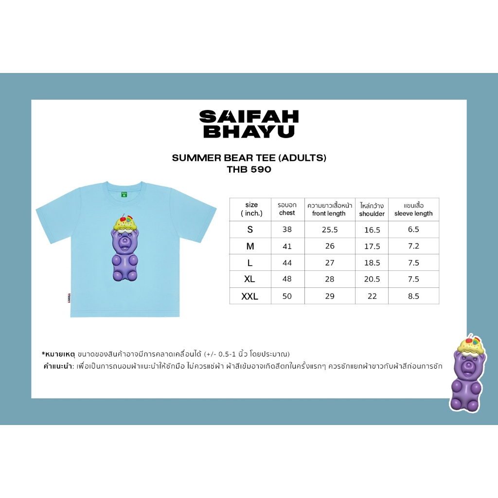CARE INSTRUCTIONS: เพื่อเป็นการถนอมผ้าแนะนำให้ซักมือ ให้ใช้น้ำยาซักผ้าชนิดอ่อน ไม่ควรแช่ผ้า ไม่ใช้น้ำยาฟอกขาว ผ้าสีเข้มอาจเกิดสีตกในครั้งแรกๆ ควรซักแยกผ้าขาวกับผ้าสี ไม่แนะนำให้อบผ้า ความร้อนจะทำให้ผ้าหด และทำให้รอยพรินต์ หรือรอยสกรีนแตก