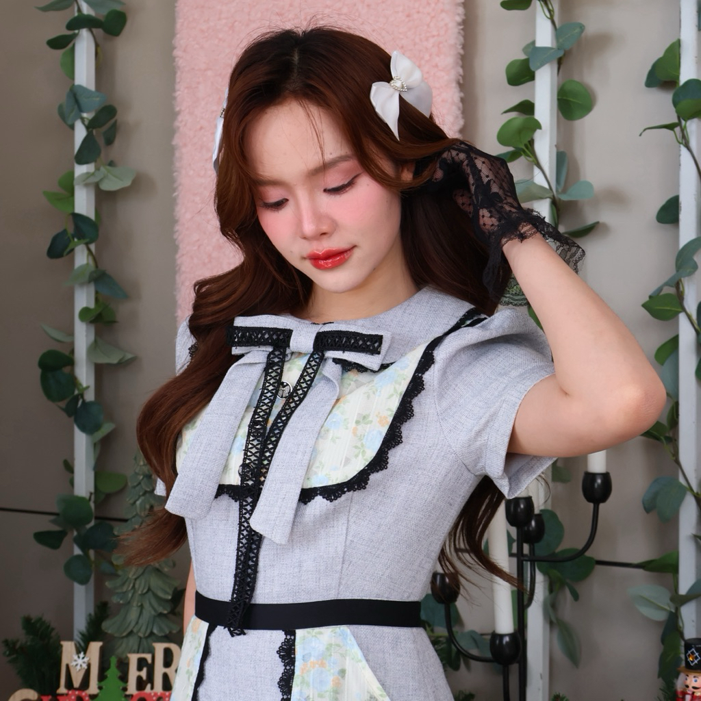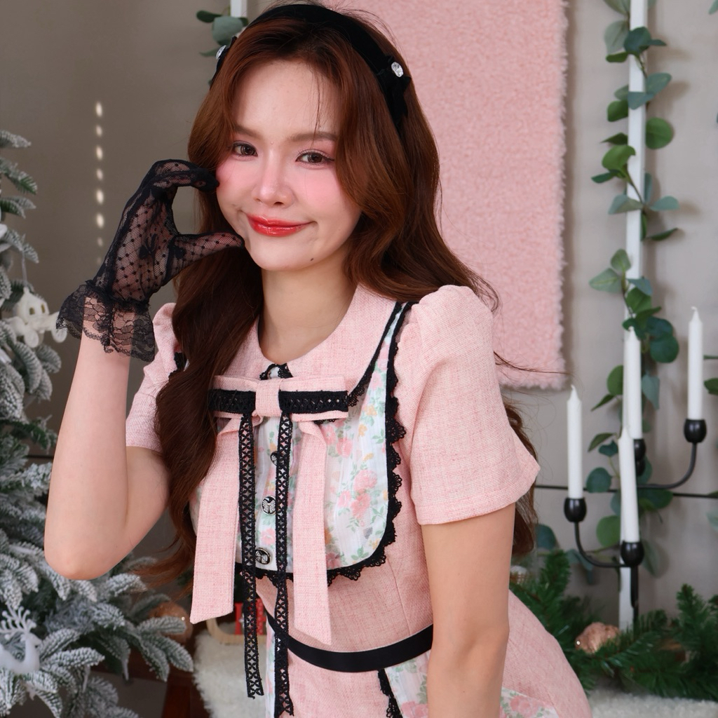 ชุดเดรสสั้นทรงเข้ารูป ผ้าทวิตทอลาย Basket เนื้อไม่หนา ปกบัวแต่งลูกไม้รอบปก ที่คอหน้าแต่งโบว์และโบว์ลูกไม้ ถอดไม่ได้