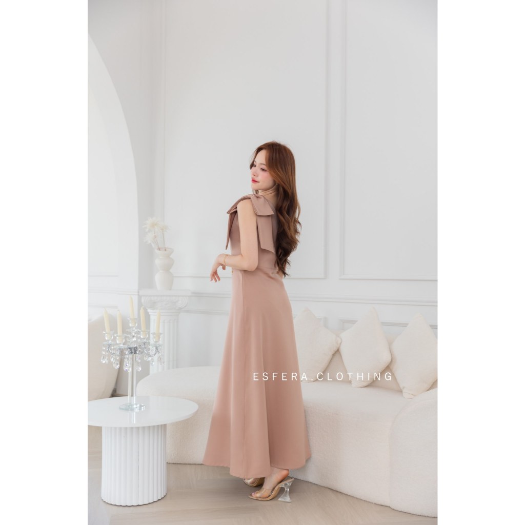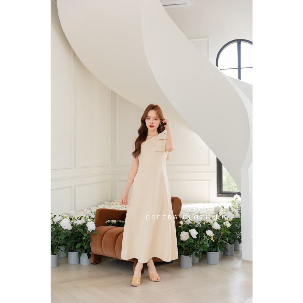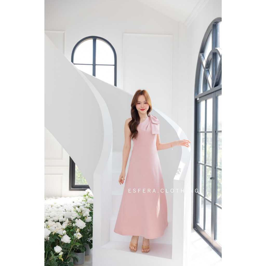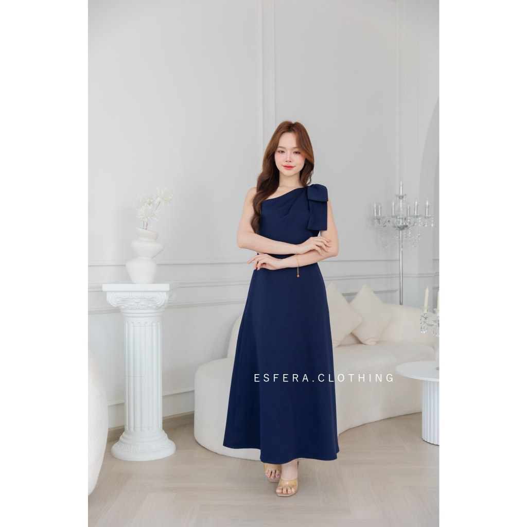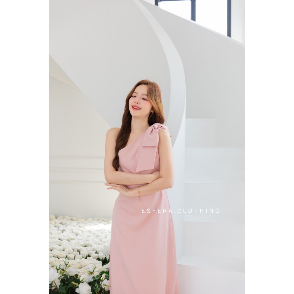 เปิดไหล่ขวา เบี่ยงซ้ายแต่งโบว์หวานๆ ลัคซูรี่เกิล เรียบหรูดูแพงมากความยาว Maxi ซิปข้างมีซับใน