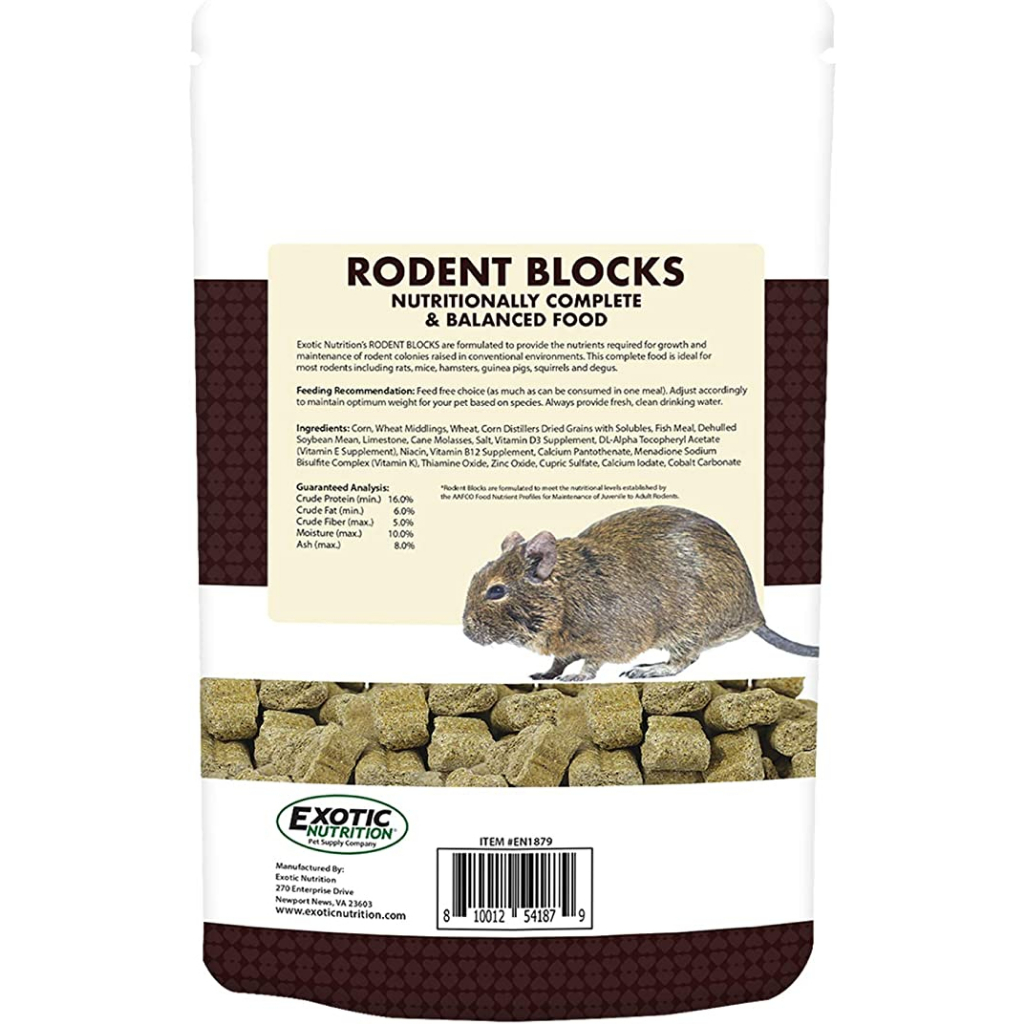 Exotic Nutrition Rodent Blocks จัดทำขึ้นเพื่อให้สารอาหารที่จำเป็นสำหรับการเจริญเติบโตและการบำรุงรักษาสำหรับสัตว์ฟันแทะส่วนใหญ่ รวมทั้งหนู หนูแฮมสเตอร์ และหนูตะเภา นอกจากนี้ยังเหมาะอย่างยิ่งสำหรับการจัดหาสารอาหารที่เหมาะสมแก่กระรอกสัตว์เลี้ยงและเดกูส อาหารที่มีคุณค่าทางโภชนาการครบถ้วนและสมดุล