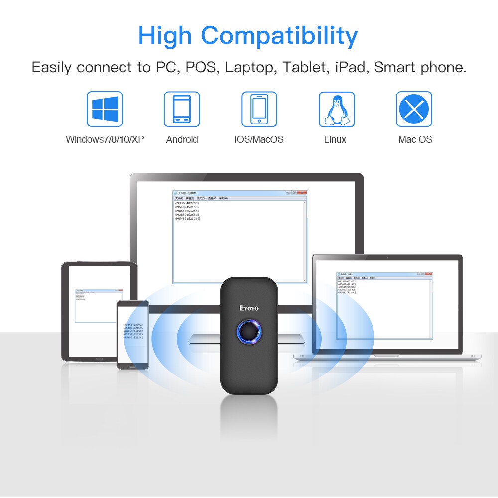 🌷เครื่องสแกนบาร์โค้ด Eyoyo Mini Pocket Bluetooth เครื่องสแกนบาร์โค้ด 1D QR 2D พร้อมบลูทู ธ Dongle Wireless 2.4G และโหมดการเชื่อมต่อ 3-in-1 แบบมีสาย ความสามารถในการถอดรหัสบาร์โค้ดที่ทรงพลังช่วงการส่งข้อมูลที่ยาวนานและใช้เวลานานทำให้น่าสนใจยิ่งขึ้น ยิ่งไปกว่านั้นขนาดกระเป๋าขนาดเล็กที่สมบูรณ์แบบและมีน้ำหนักเพียง 35g / 1.23oz ทำให้เครื่องสแกน Eyoyo นี้เหมาะสำหรับคุณ