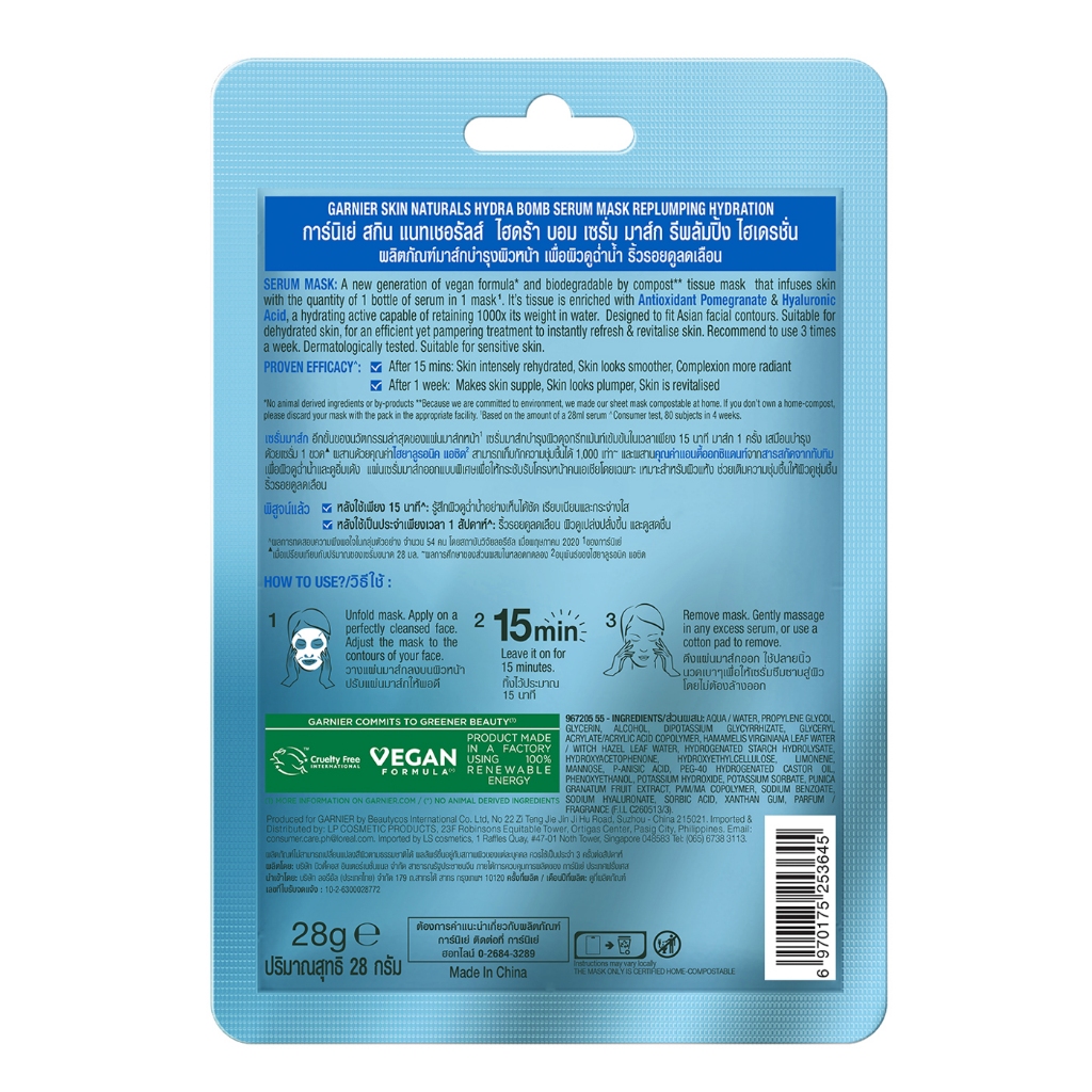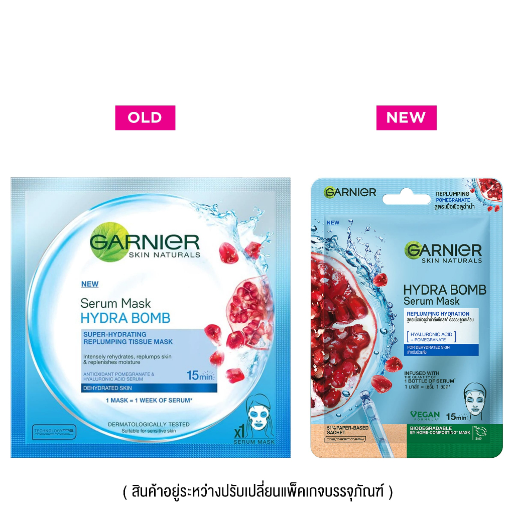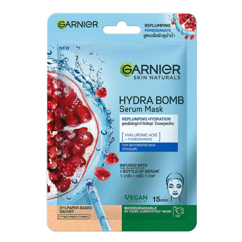 GARNIER Serum Mask Hydra Bomb อีกขั้นของนวัตกรรมล่าสุดของแผ่นมาส์กหน้าที่ให้การบำรุงผิวคล้ายกับการใช้เซรั่มบำรุงผิวเข้มข้นในเวลาเพียง 15 นาที อุดมด้วยคุณค่าไฮยาลูรอนิค แอชิด ที่สามารถเก็บกักความชุ่มชื้นได้ 1,000 เท่า จึงเหมาะสำหรับคนผิวแห้ง ขาดความชุ่มชื้น