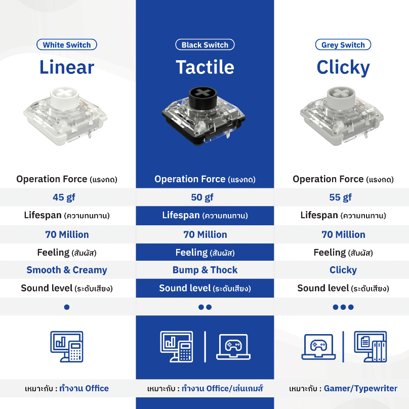 ⬜⬜⬛ มีสวิสต์ให้เลือก 3 แบบ White (Linear) , Grey (Clicky) , Black (Tactile)