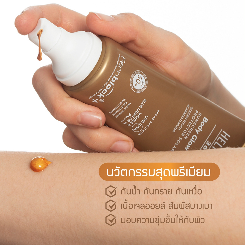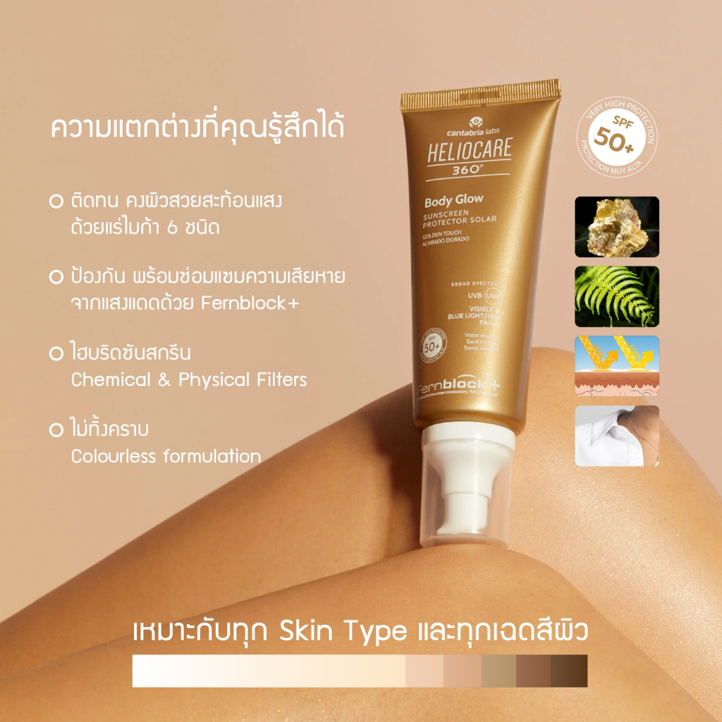 ครีมกันแดดผิวกาย ช่วยป้องกันแสงแดด UVA, UVB, HEVL, IR ติดทน คงผิวสวยสะท้อนแสงด้วยแร่ไมกา 6 ชนิดที่ช่วยให้ผิวดูมีสีทองแวววาว เนื้อสัมผัสบางเบา มอบความชุ่มชื้นให้แก่ผิว และมีกลิ่นหอมสดชื่น ไม่ทิ้งคราบขาว สามารถกันน้ำ กันทราย กันเหงื่อได้ หมาะสำหรับทุกสภาพผิว และทุกสีผิว