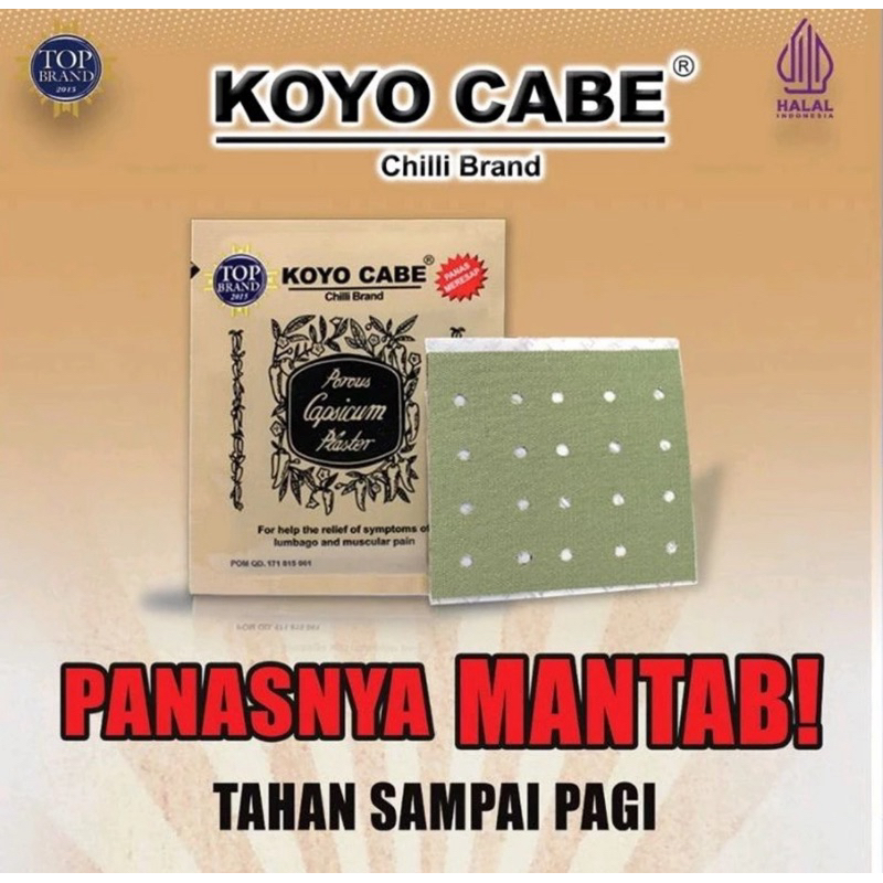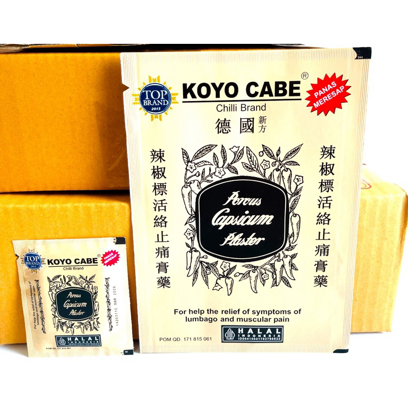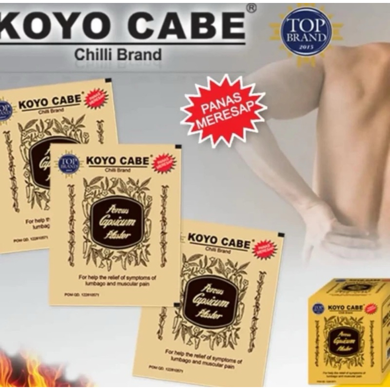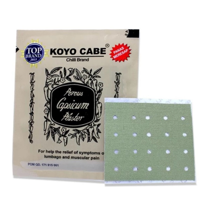 KOYO CABE is a pain relief patch containing chili extract (Capsicum) which can be used to help relieve pain due to gout, aches and pains, muscle aches, neck pain, back pain, headaches, toothache, bruises, sprains and joint pain.