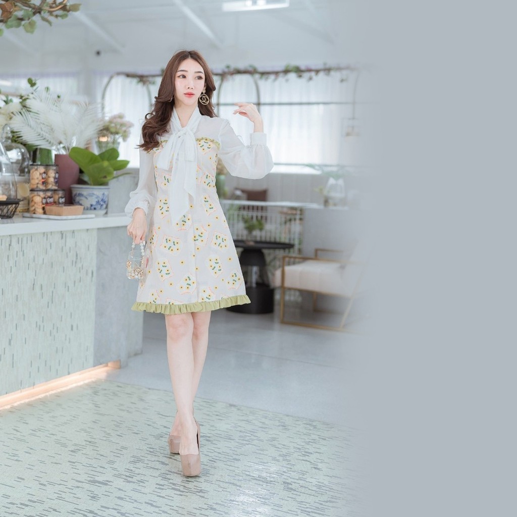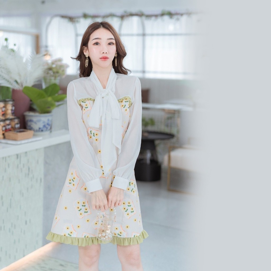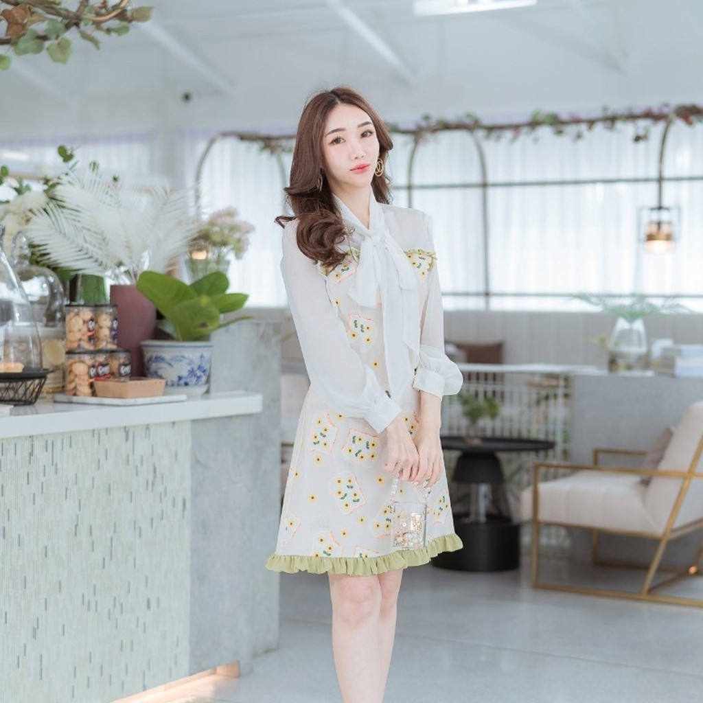 น่ารักแบบชนชั้นสูง | เอเดรสกระดุมหน้า กิมมิคปกคอแบบ Pussy-Bow Neck และ แพทเทิร์นเขน Blouson Sleeves ชิ้นแขนทำจากผ้าชีฟองเนื้อนิ่ม ตัวชุดเป็นผ้าไหมอิตาลีไม่หนา ใส่สบายเย็น พิมพ์ลาย Sunflow-Toasties สีละมุนมากๆ เพิ่มความน่ารักไปอีกหนี่งดีวีชั่นด้วยระบายชีฟองที่ชายกระโปรงและบ่าหน้า... บอกเลย น่ารักจนต้องมีคำนำหน้าว่า ท่านหญิง