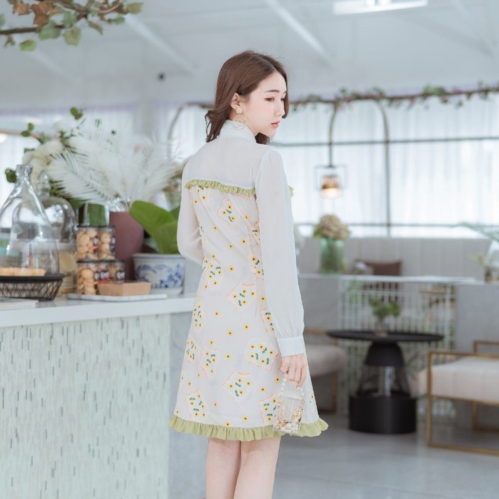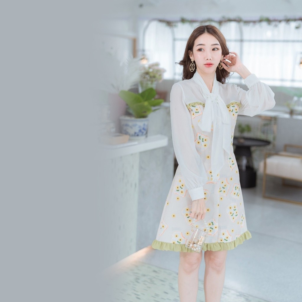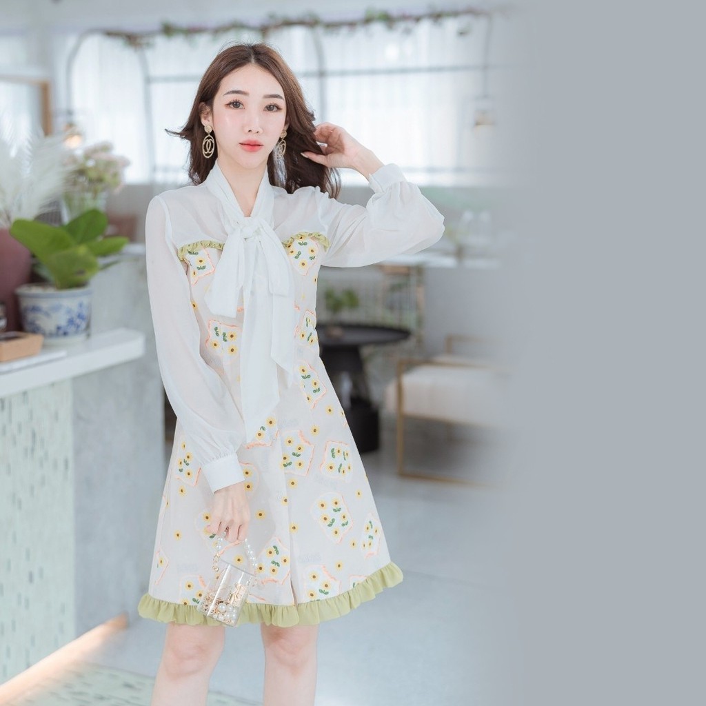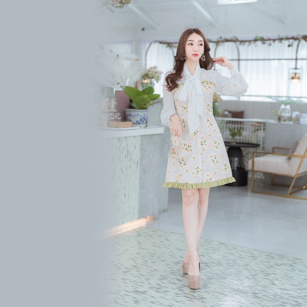 น่ารักแบบชนชั้นสูง | เอเดรสกระดุมหน้า กิมมิคปกคอแบบ Pussy-Bow Neck และ แพทเทิร์นเขน Blouson Sleeves ชิ้นแขนทำจากผ้าชีฟองเนื้อนิ่ม ตัวชุดเป็นผ้าไหมอิตาลีไม่หนา ใส่สบายเย็น พิมพ์ลาย Sunflow-Toasties สีละมุนมากๆ เพิ่มความน่ารักไปอีกหนี่งดีวีชั่นด้วยระบายชีฟองที่ชายกระโปรงและบ่าหน้า... บอกเลย น่ารักจนต้องมีคำนำหน้าว่า ท่านหญิง