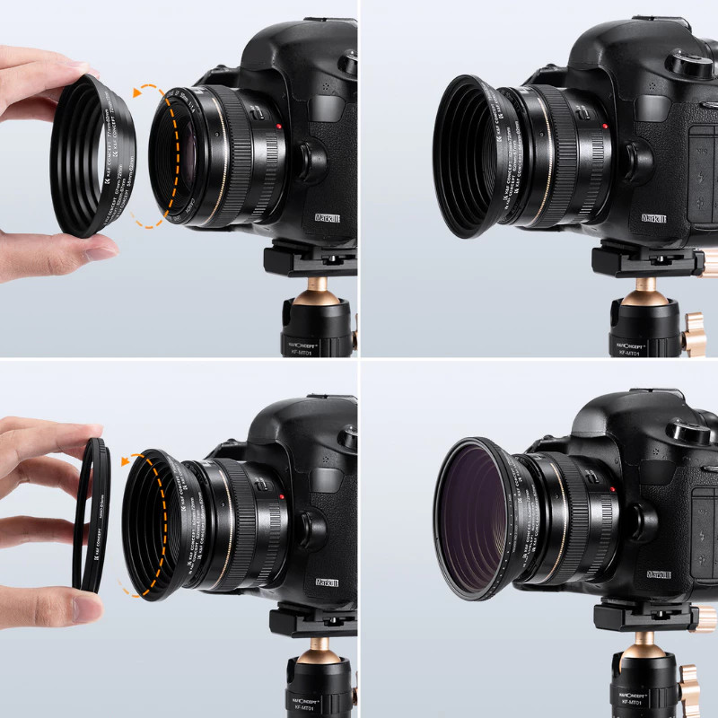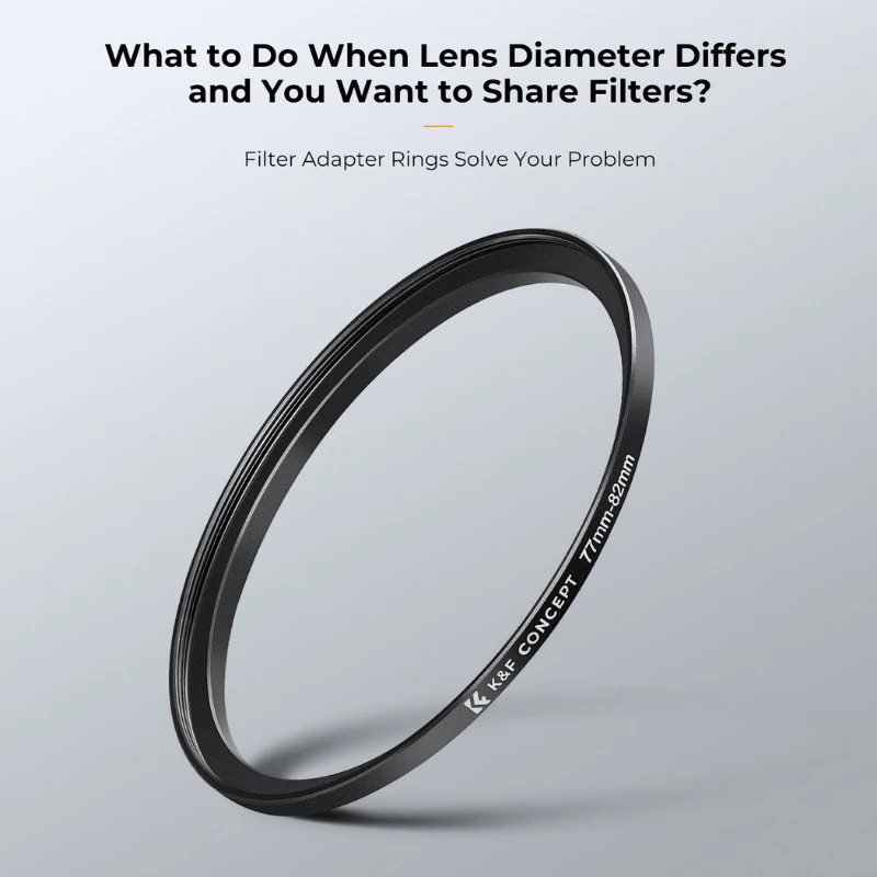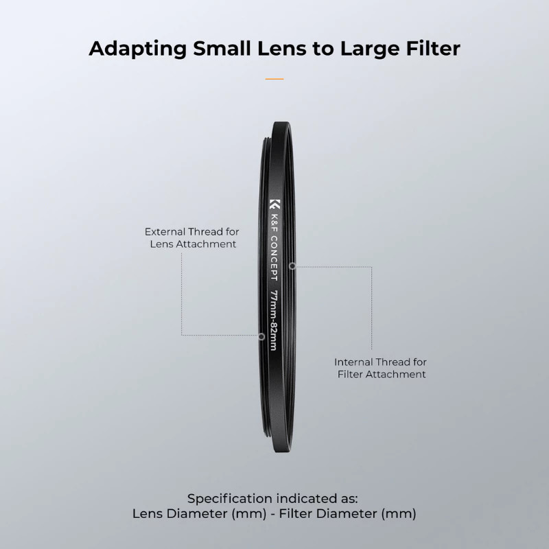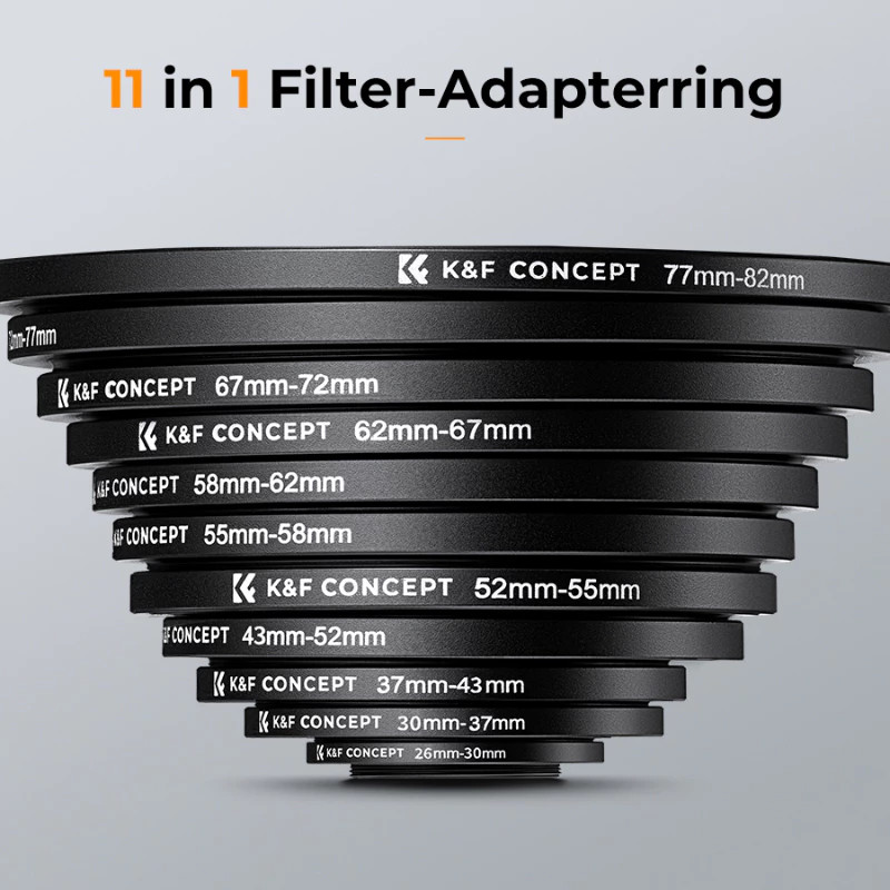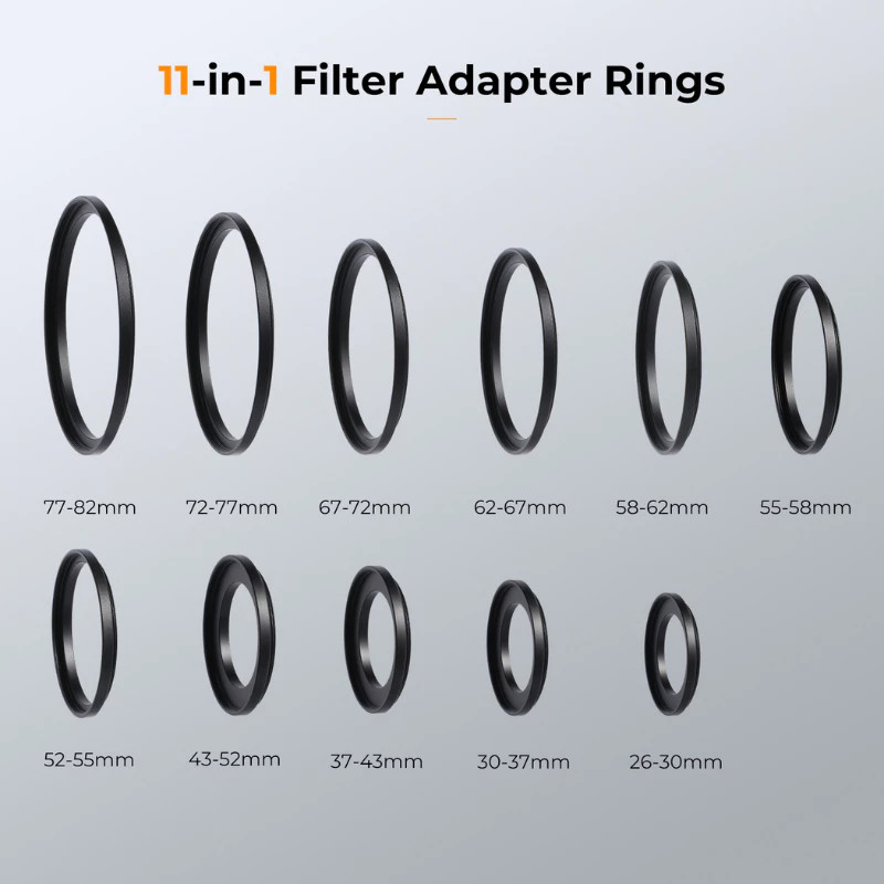 - อุปกรณ์นี้ประกอบด้วยแหวนแปลงขนาดเลนส์ (Step Up Ring) โลหะจำนวน 11 ชิ้น โดยมีขนาด ดังนี้ 26-30 มม. 30-37 มม. 37-43 มม. 43-52 มม. 52-55 มม. 55-58 มม. 58-62 มม. 62-67 มม. 67-72 มม. 72-77 มม. 77-82 มม.