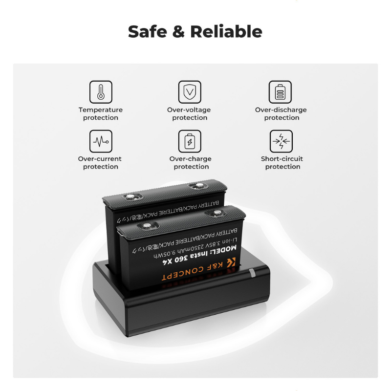 * Safe and Reliable. The Insta 360 X4 battery is designed to perform efficiently in a variety of environmental conditions, ensuring reliable operation in both high and low temperatures. It includes a safety protection circuit to prevent potential hazards such as overcharging, short circuits, and overheating.