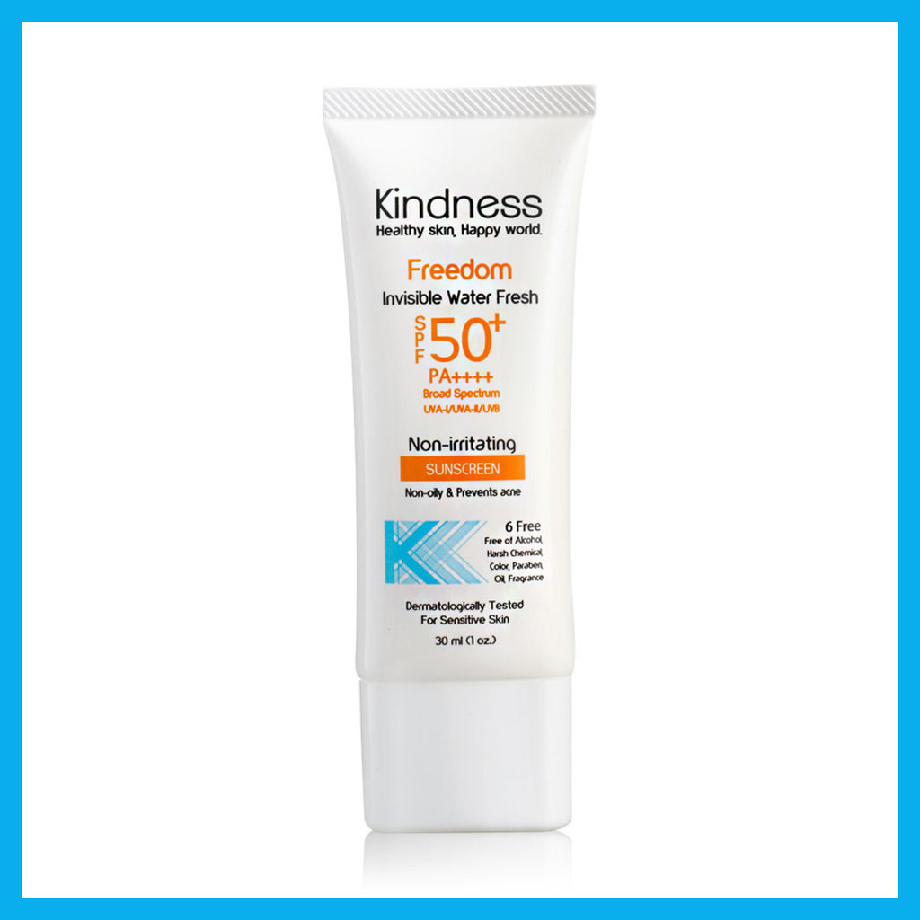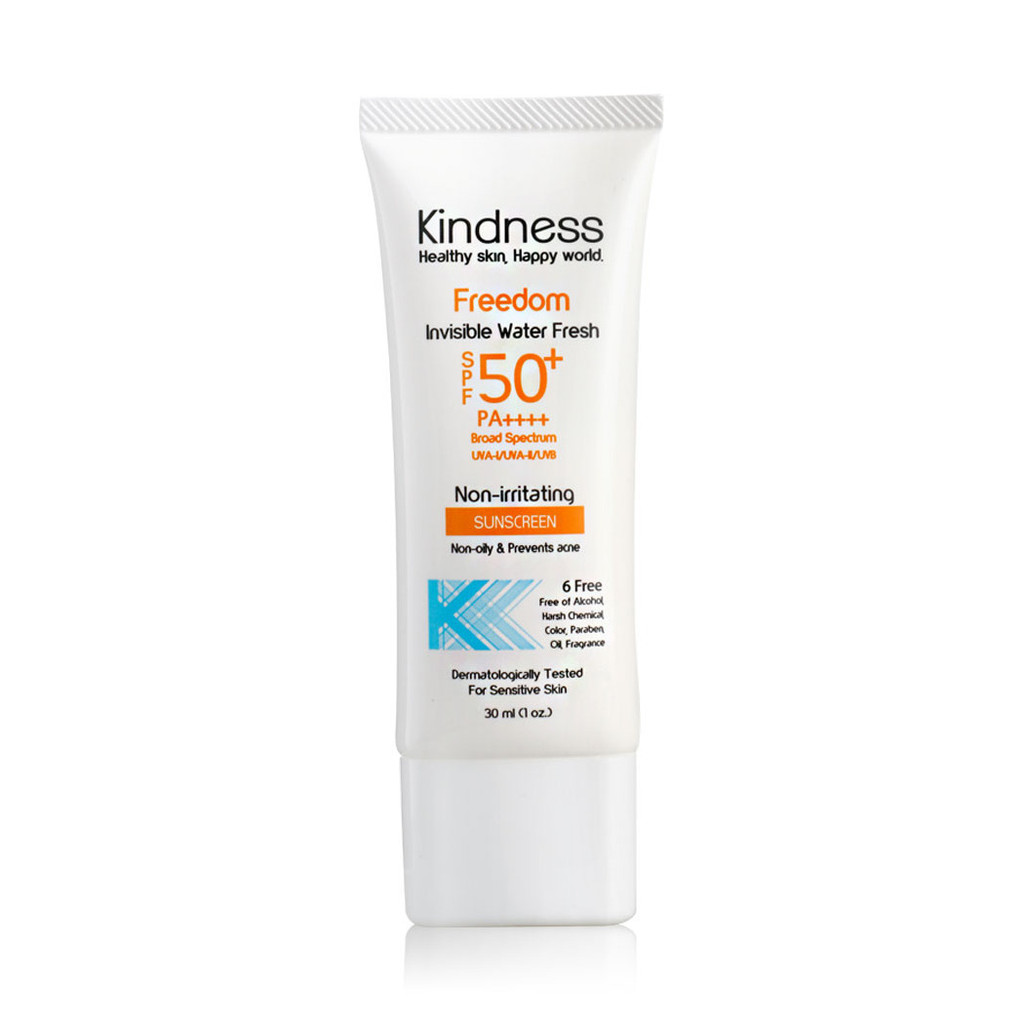 Kindness Freedom Invisible Water Fresh SPF50+/PA++++ 30ml ครีมกันแดดสูตรเบาสบายดุจน้ำ สำหรับผิวบอบบางแพ้ง่าย เพื่อผิวสดชื่น สบายผิว ซึมเร็ว ไม่วอก ไม่เป็นคราบ ไม่มัน ไม่อุดตัน ด้วยซิงค์ออกไซด์ และเทคโนโลยีอัจฉริยะเก็บกักกันแดดในแคปซูล ปกป้องแบบ Broad Spectrum พร้อมสารสกัดธรรมชาติเพิ่มความชุ่มชื้น ลดการระคายเคืองของผิวจากแสงแดด และลดการเกิดสิว