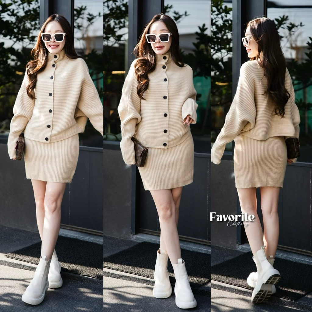 🌈🌿🌼🌸🌺❤️🧡🩶🇰🇷 Knit Texture Button Long Sleeve Top&Short Skirt Set
