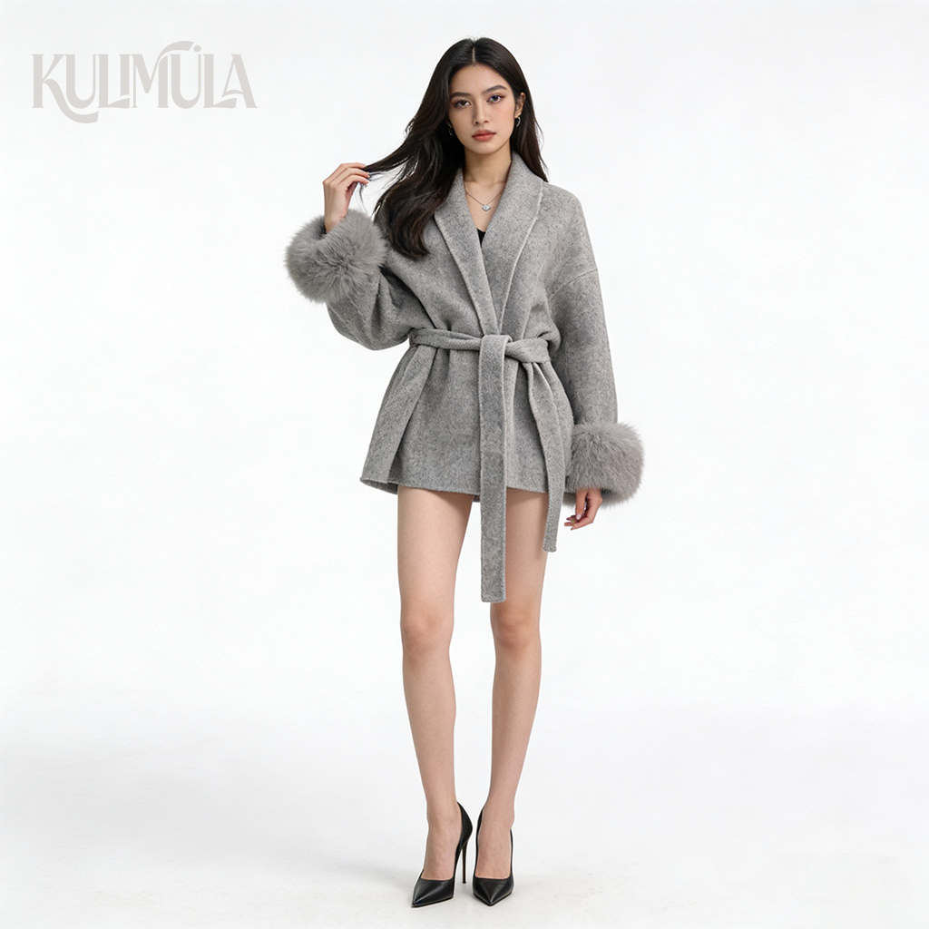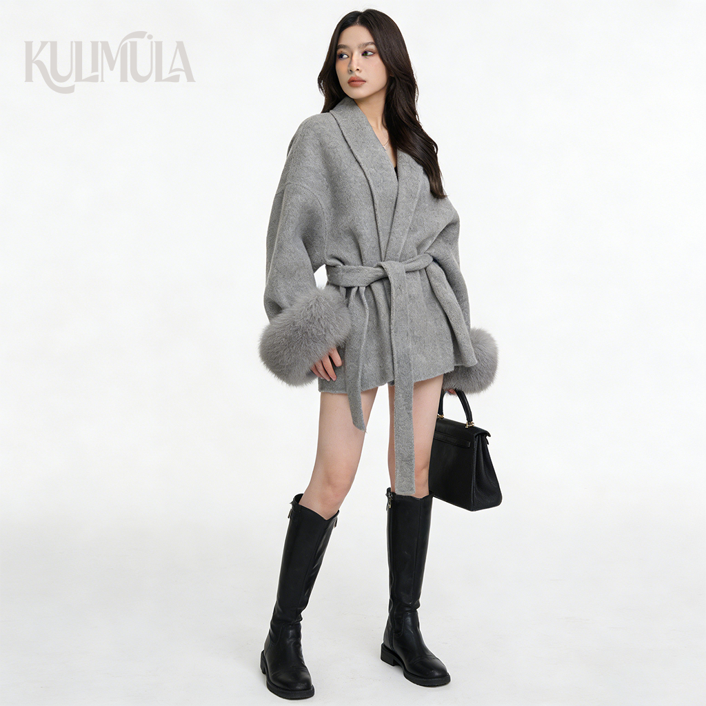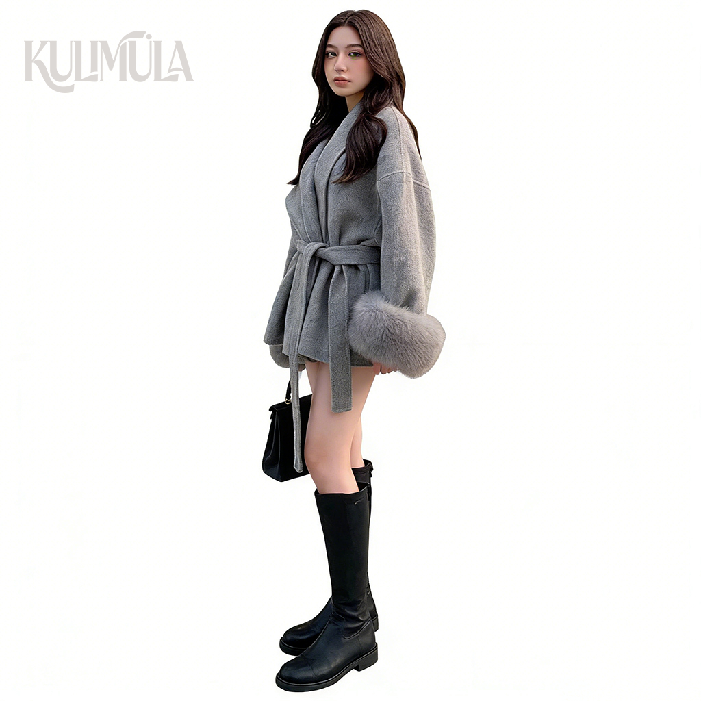 KULIMULA เสื้อคลุมแขนขน แต่งขนจิ้งจอกโดดเด่น เข็มขัดรัดเอวสไตล์หรูตกแต่งสุดเซ็กซี่ ผ้าขนสัตว์นุ่มอบอุ่น YD5