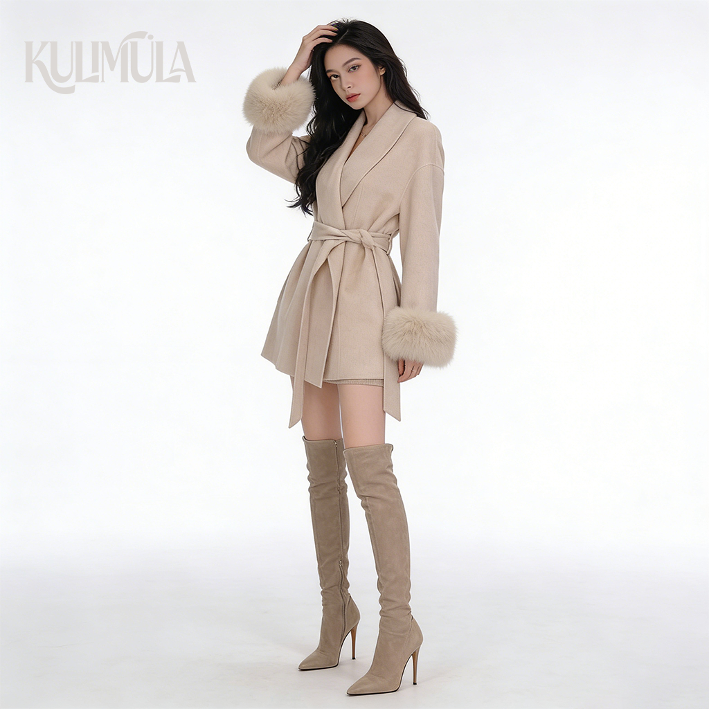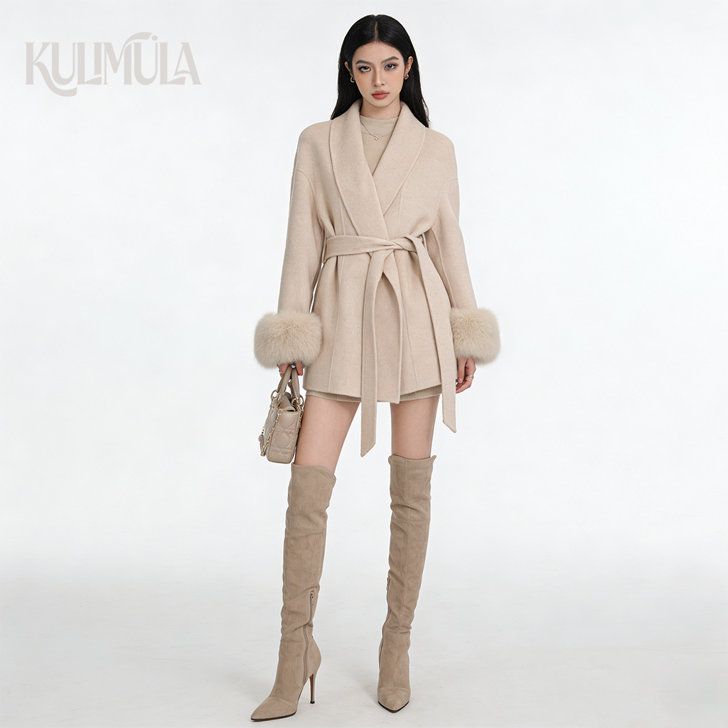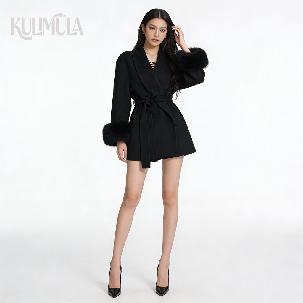 KULIMULA เสื้อคลุมแขนขน แต่งขนจิ้งจอกโดดเด่น เข็มขัดรัดเอวสไตล์หรูตกแต่งสุดเซ็กซี่ ผ้าขนสัตว์นุ่มอบอุ่น YD5