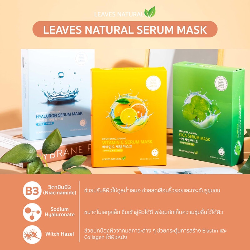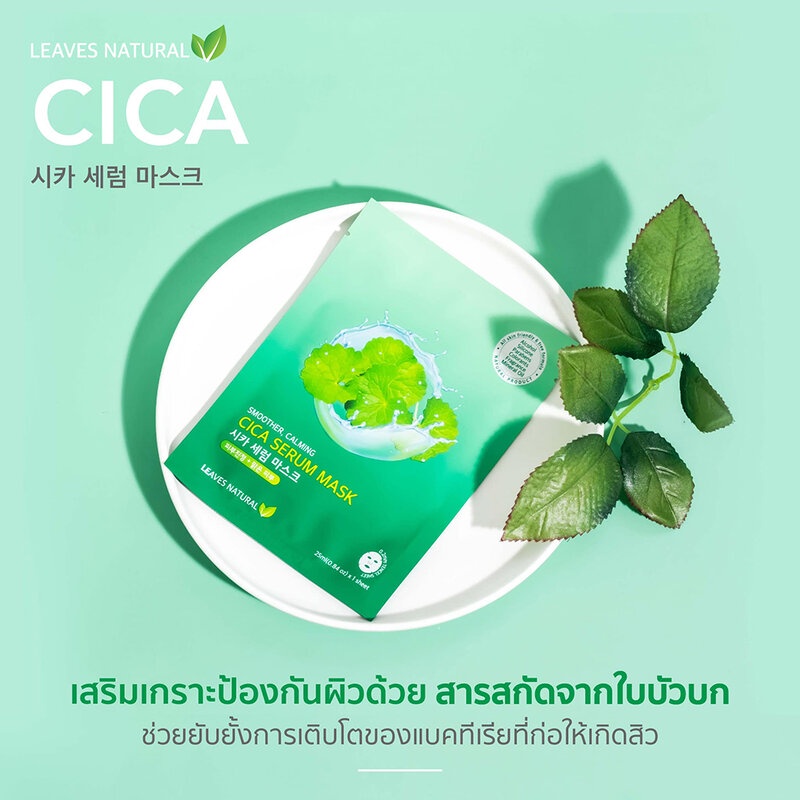 Leaves Natural Cica Serum Mask 25ml แผ่นมาสก์หน้า ด้วยสารสกัดจากใบบัวบก ช่วยเสริมเกราะป้องกันผิวจากเชื้อแบคทีเรียที่ก่อให้เกิดสิว และช่วยปลอบประโลมผิวที่เป็นสิว ให้กลับมาเรียบเนียน ชุ่มชื้น น่าสัมผัส
