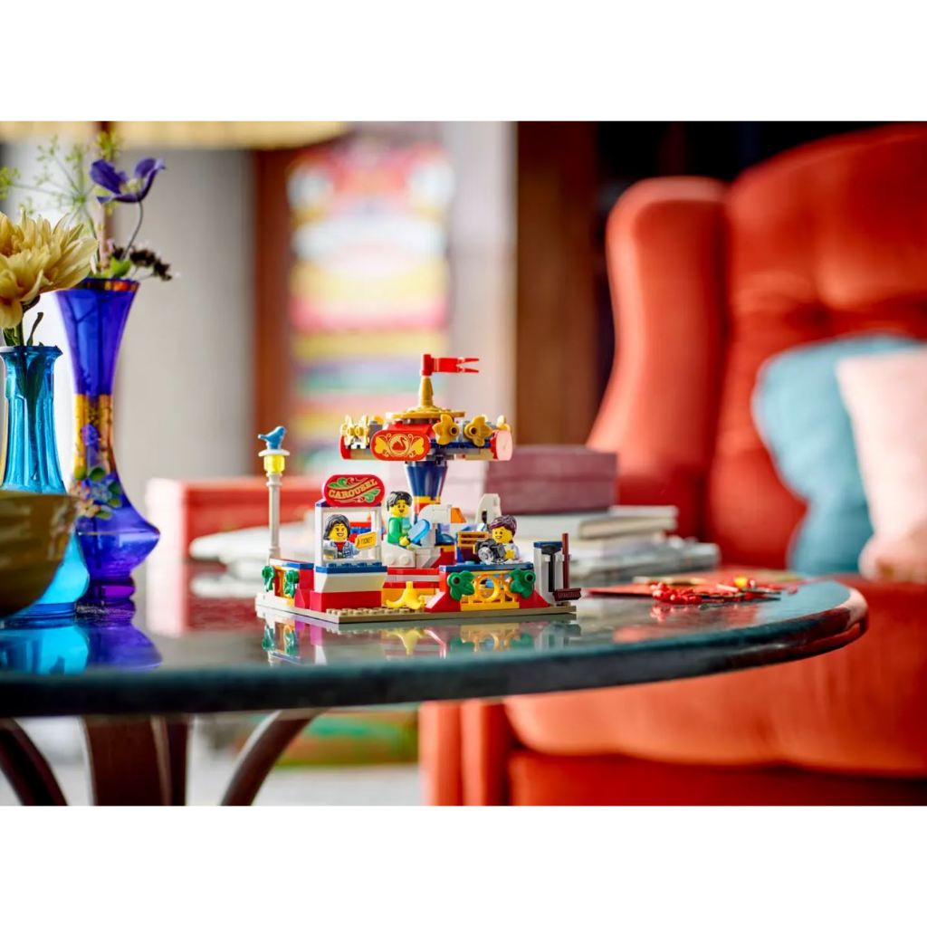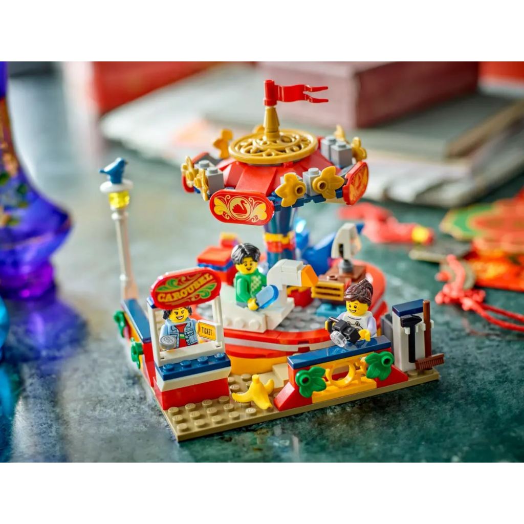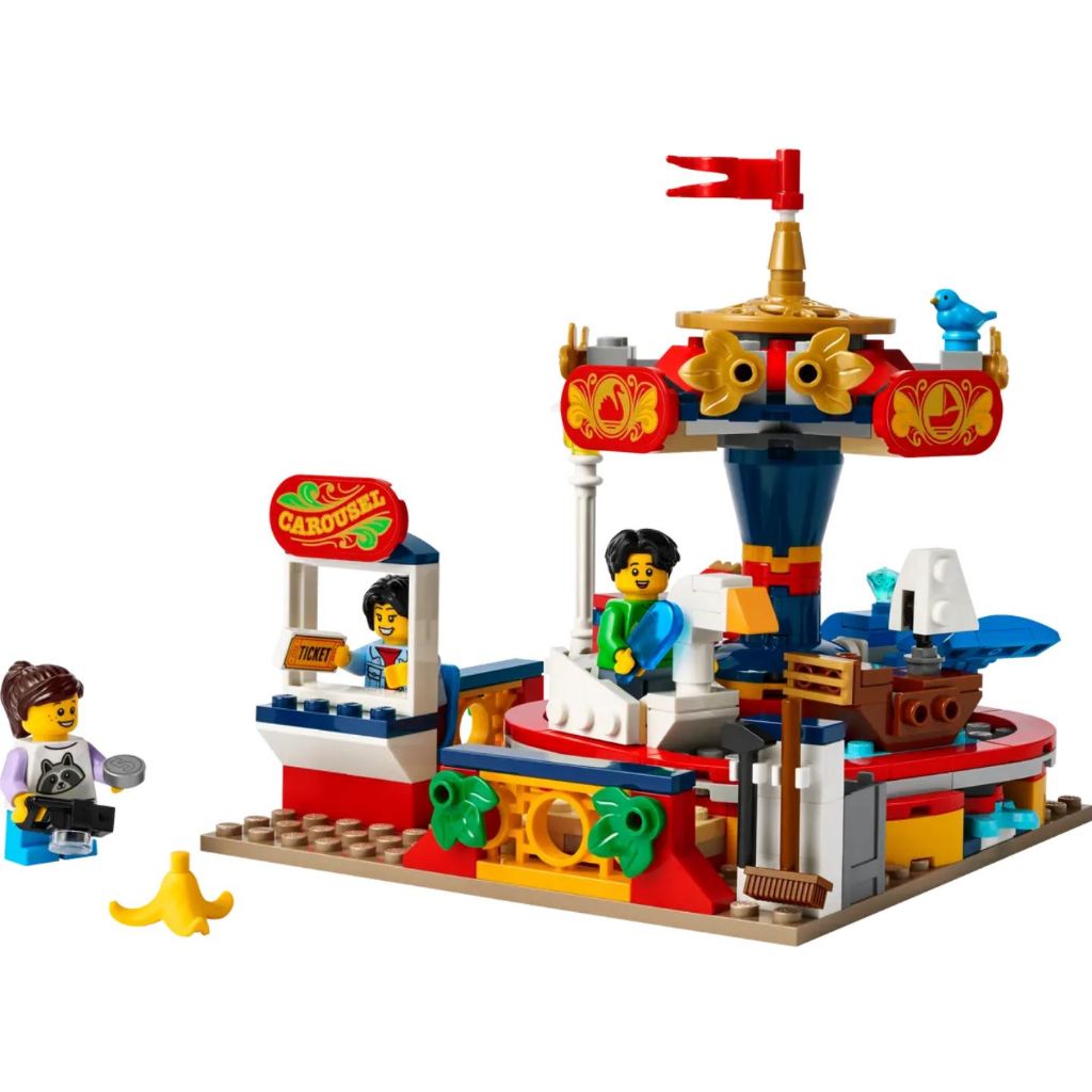Kids aged 8+ can play out fun action with the detailed LEGO® Carousel Ride building set. Decorated in vibrant colors, this amusement park toy features 4 carts, consisting of a swan, a whale, a fire truck and a boat, which can be rotated by turninga pedal gear in its base. There are also 3 minifigures, including a ticket seller, plus a boy with an ice cream and a girl with a camera who can ride in the carts.