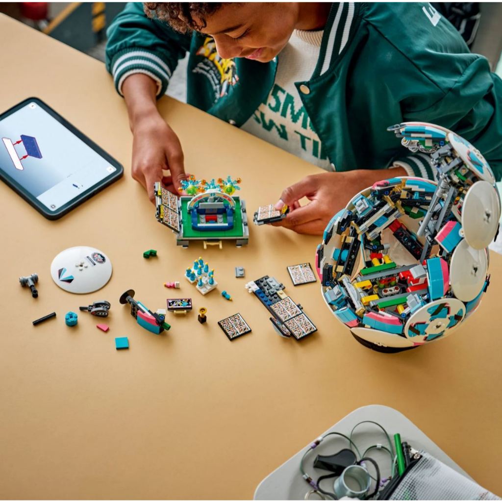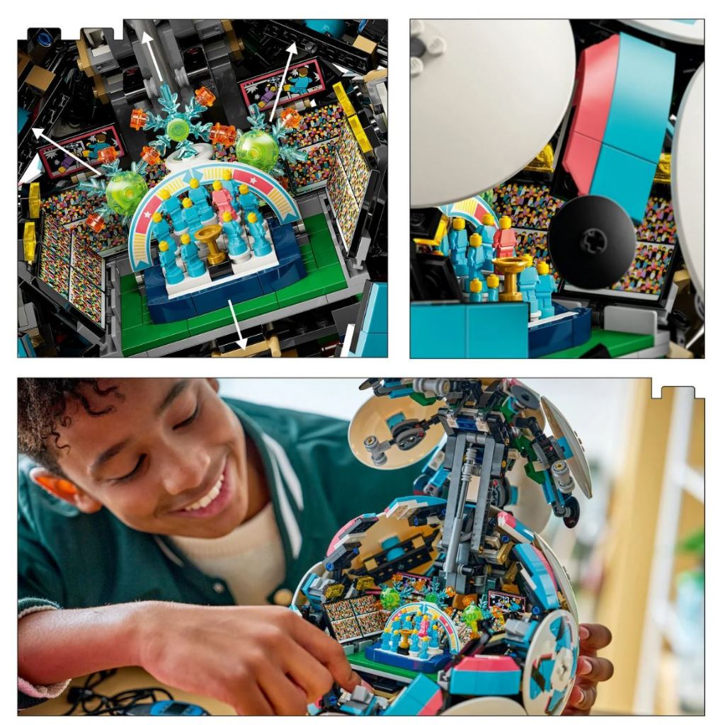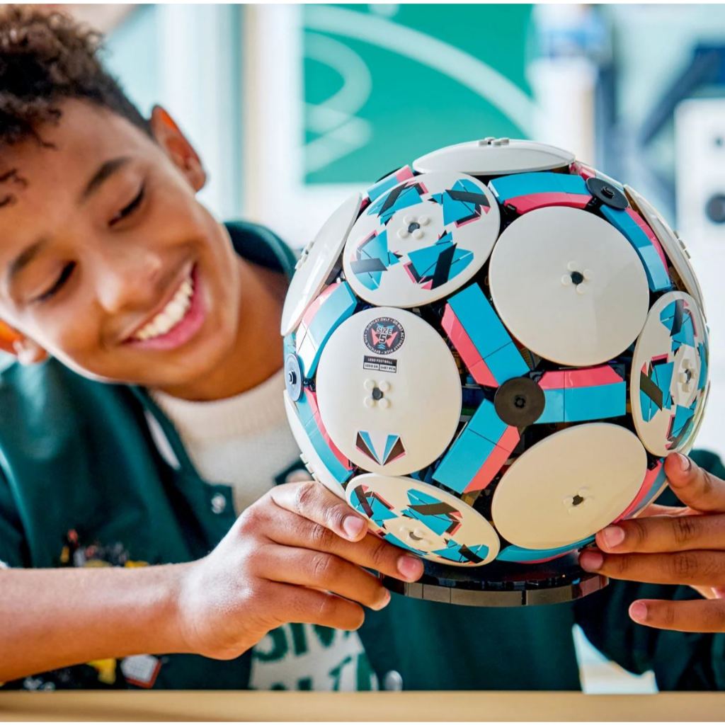The collectable set includes LEGO Technic elements to achieve a rounded shape, and the outside of the ball features 6 stylish deco discs, while inside there’s an exciting mini stadium celebration scene waiting to be discovered. Kids can press the button and watch the moment football player figures celebrate a win, with fireworks popping off behind the stage.