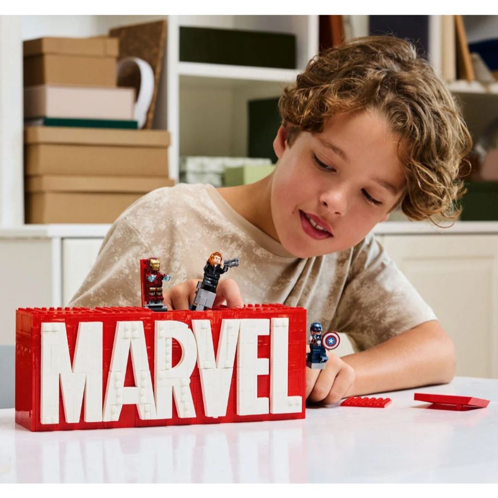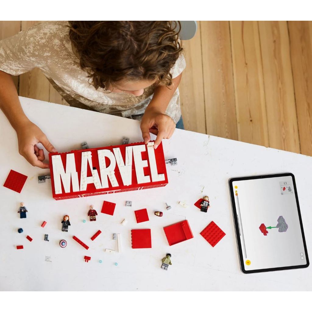 The buildable MARVEL logo set is assembled using bold red and white bricks. Kids press 3 separate buttons on the top of the logo to make Hulk, Thor, Iron Man, Black Widow and Captain America minifigures burst from the Marvel model, bringing Avengers action to life right before their eyes. Each minifigure easily returns to its original position. For added digital fun, builders can zoom in, rotate models in 3D and track their progress using the fun, intuitive LEGO Builder app.