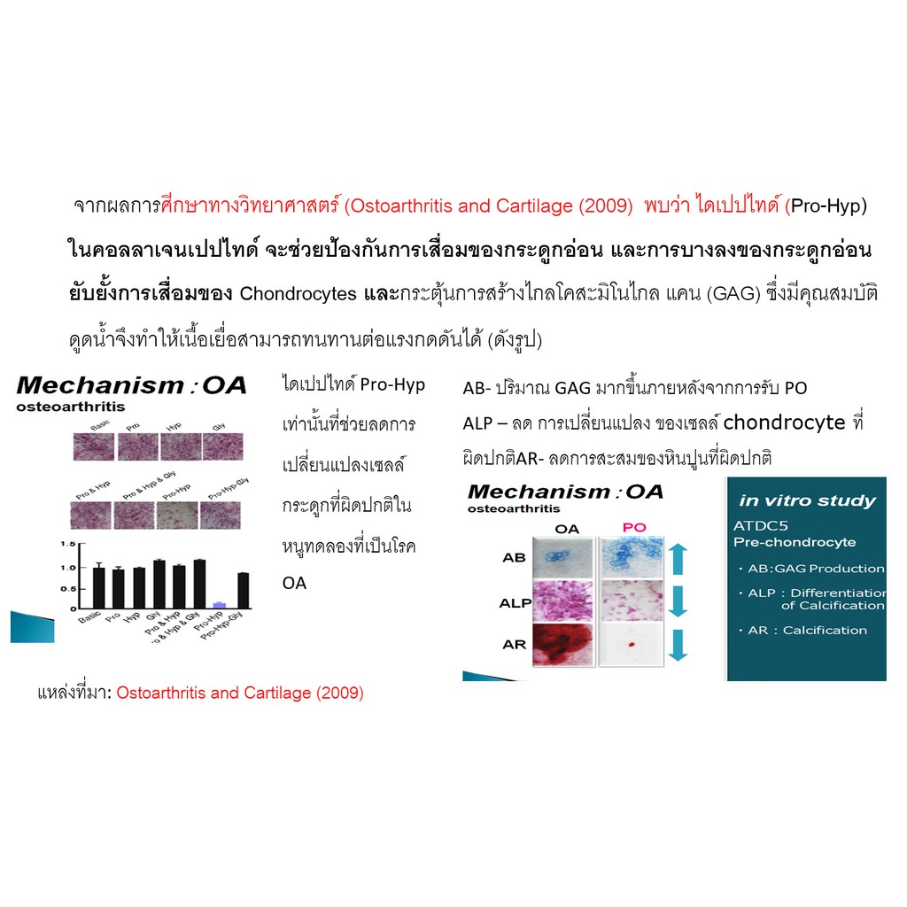 จากผลการศีกษาทางวิทยาศาสตร์ (Ostoarthritis and Cartilage (2009) พบว่า ไดเปปไทด์ (Pro-Hyp) ในคอลลาเจนไดเปปไทด์ จะช่วยป้องกันการเสื่อมของกระดูกอ่อน และการบางลงของกระดูกอ่อน ยับยั้งการเสื่อมของ Chondrocytes และกระตุ้นการสร้างไกลโคสะมิโนไกล แคน (GAG) ซึ่งมีคุณสมบัติดูดน้ำจึงทำให้เนื้อเยื่อสามารถทนทานต่อแรงกดดันได้