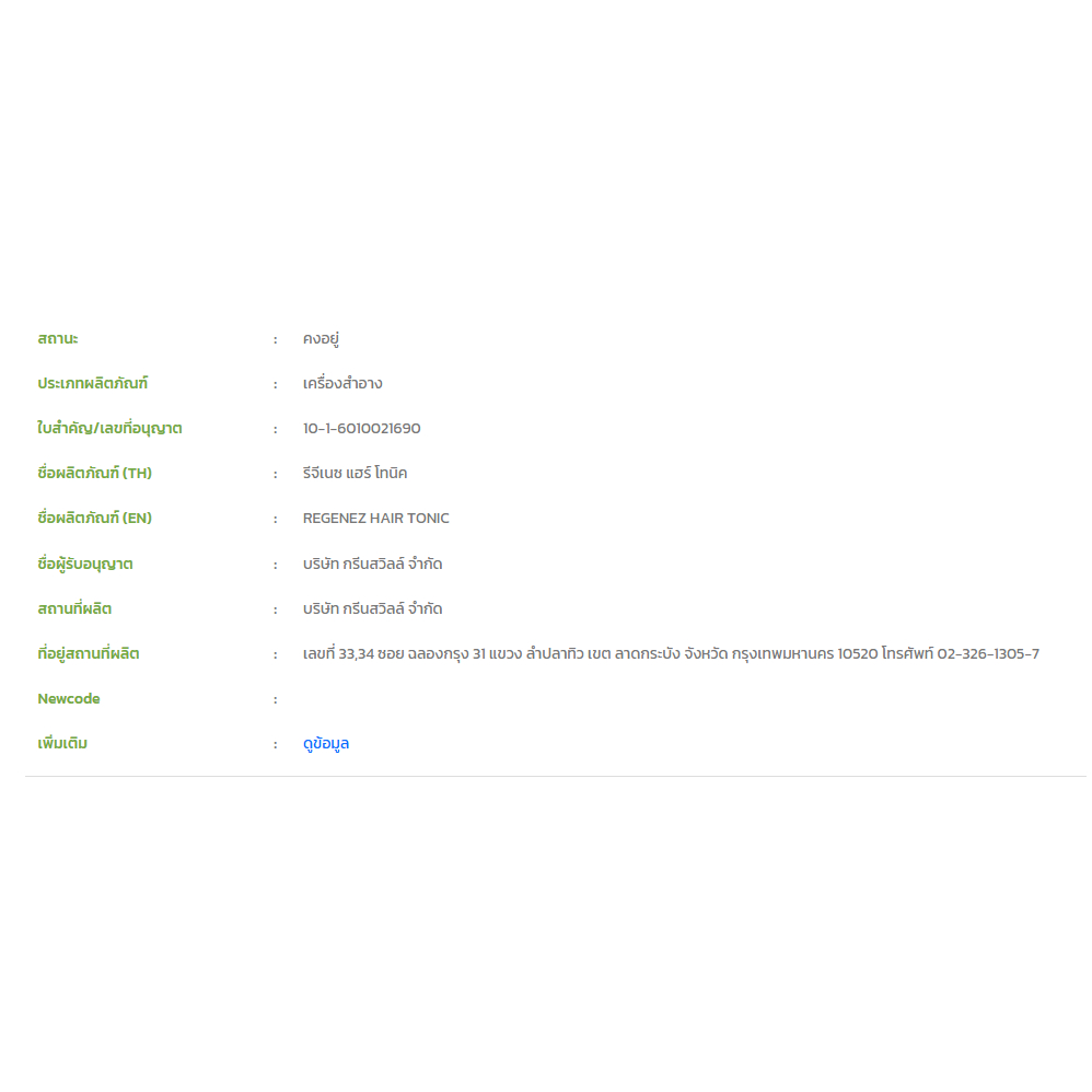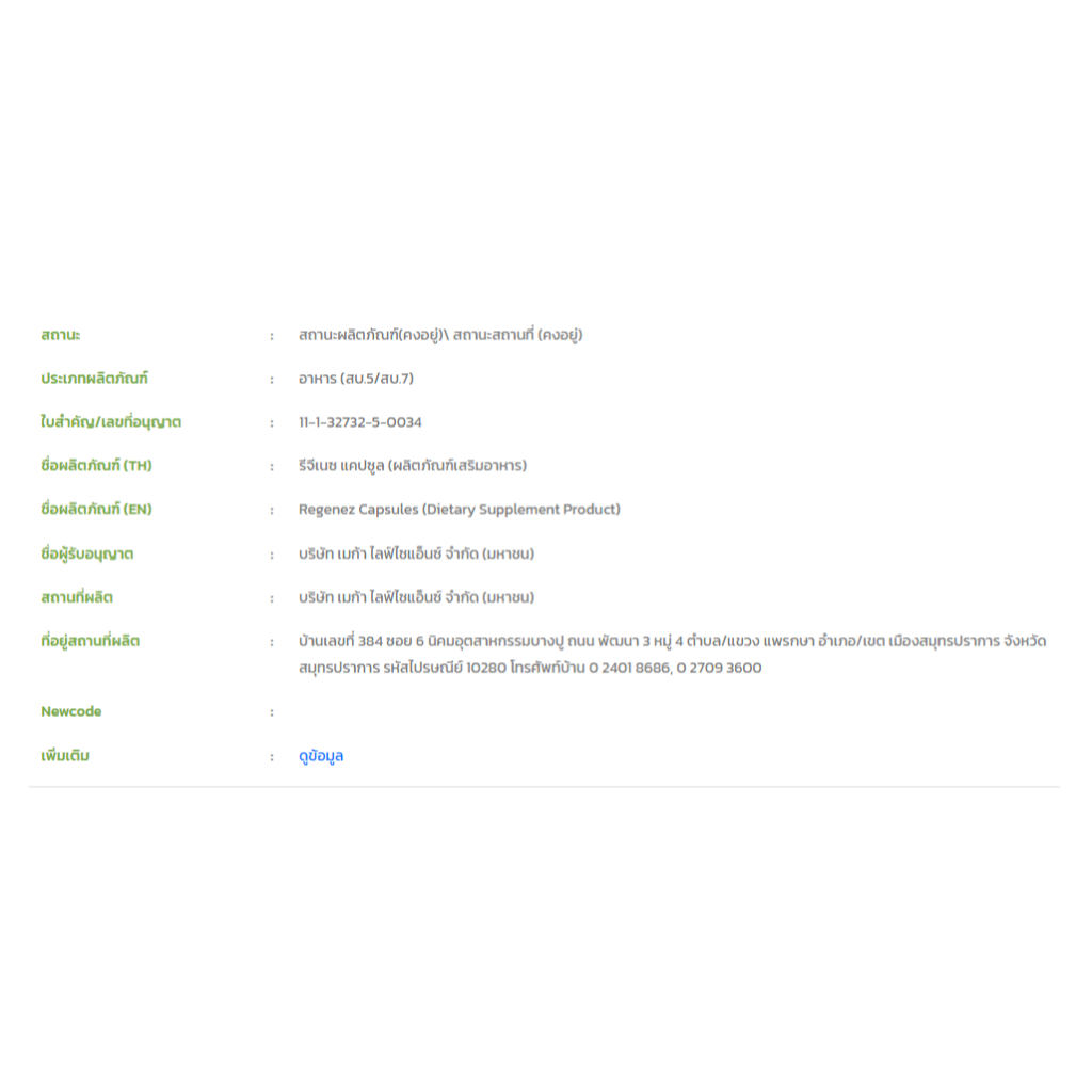 ชื่อผลิตภัณฑ์ (ไทย) : รีจีเนซ แคปซูล (ผลิตภัณฑ์เสริมอาหาร)