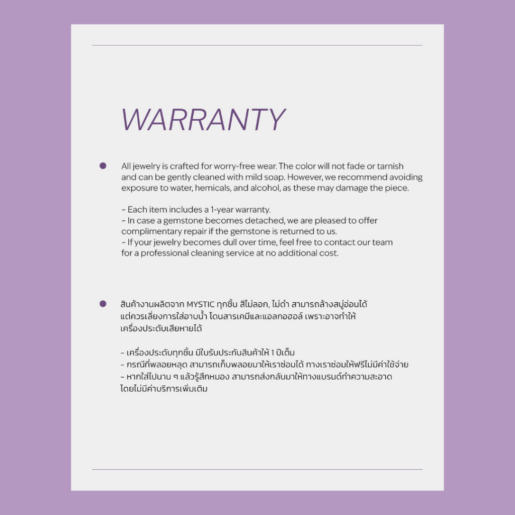 - เครื่องประดับทุกชิ้นมีใบรับประกันสินค้าให้ 1 ปีเต็ม