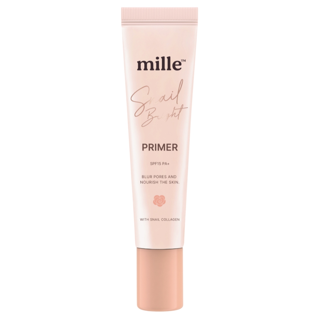 MILLE Snail Bright Primer SPF15 PA+ ไพรเมอร์ที่ช่วยอำพรางผิวให้เรียบเนียน พร้อมมอบความชุ่มชื้นให้ผิวหน้าสวยผ่องดูสุขภาพดีตลอดเวลา ไม่หมองคล้ำระหว่างวัน ด้วยสารสกัดจากเมือกหอยทาก ช่วยเพิ่มความยืดหยุ่นกระชับให้แก่ผิว