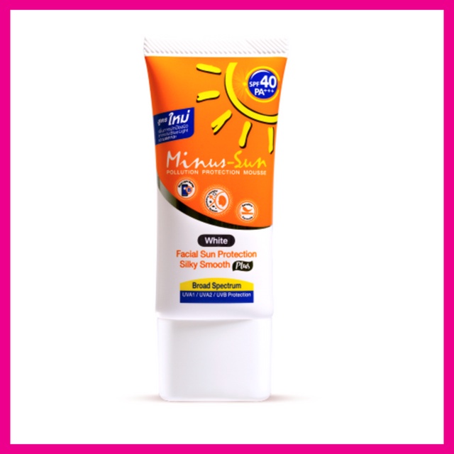 ไมนัส-ซัน เอส พี เอฟ 40 พีเอ +++ (ไวท์) พอลลูชั่น โพรเทคชั่น มูส ผลิตภัณฑ์ปกป้องผิวจากแสงแดดเนื้อ Silky Smooth ให้สัมผัสเบาสบาย ไม่มันเหนอะหนะ ควบคุมความมัน ปรับสูตรใหม่ ประสิทธิภาพสูงปกป้องครอบคลุม UVA / UVB Broad Spectrum พิเศษยิ่งขึ้น เพือการปกป้องผิวจากมลภาวะที่ผู้บริโภคยุคใหม่ต้องพบเจออย่างหลีกเลี่ยงไม่ได้ เช่นฝุ่น ควัน มลภาวะต่างๆในชีวิตประจำวัน และแสงสีฟ้า จากหน้าจออุปกรณ์อิเล็คโทรนิครูปแบบต่างๆ อันเป็นสาเหตุให้เกิดปัญหาผิวหมองคล้ำและผิวแก่ก่อนวัย รวมถึงสูตรใหม่ อ่อนโยน สบายผิว ทาได้แม้บริเวณที่ผิวบอบบาง