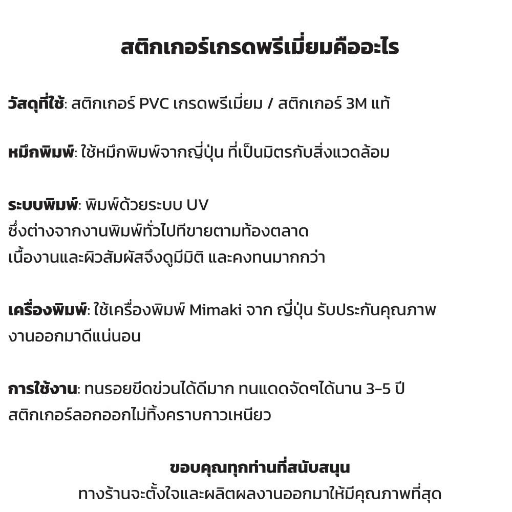 ✔ ผู้ผลิตและจำหน่ายสติกเกอร์เกรดพรีเมี่ยม สินค้าคุณภาพระดับโรงงาน มาตรฐานญี่ปุ่น รับประกันคุณภาพ 100% ครับ
