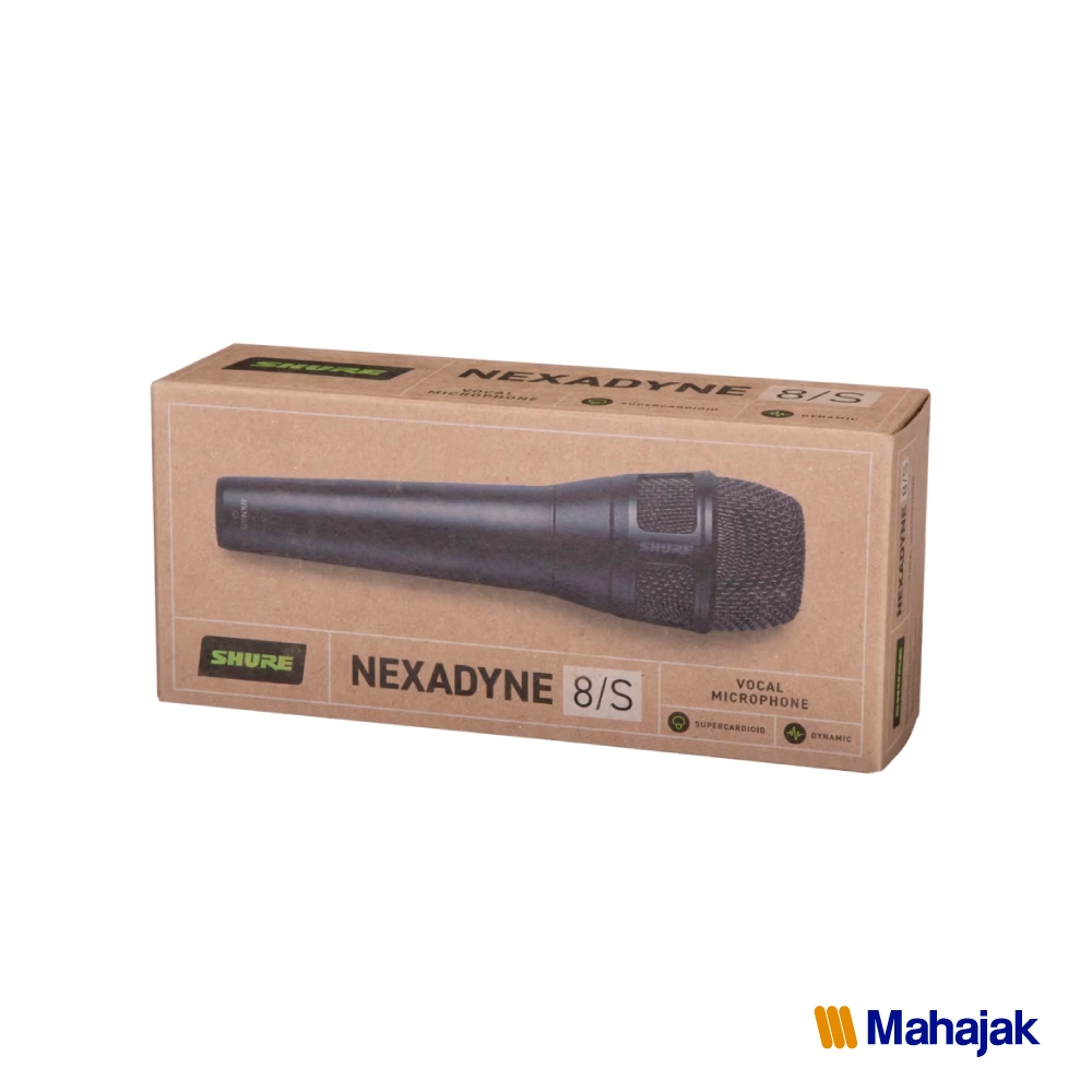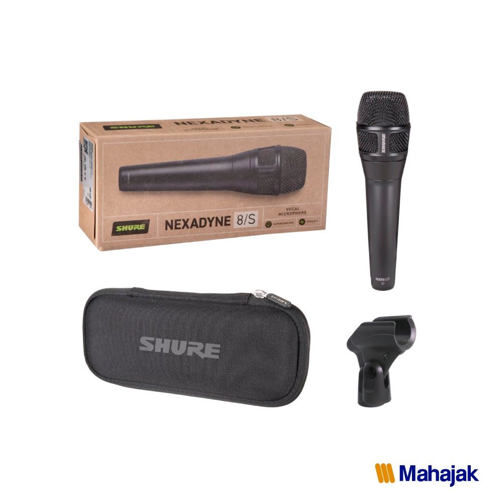 Nexadyne™ 8/S Dynamic Vocal Microphone เป็นไมโครโฟนไดนามิกแบบ Supercardioid สำหรับงานร้องเพลงบนเวทีระดับมืออาชีพ พร้อมเทคโนโลยีขุมกำลังทรานสดิวเซอร์แบบคู่ (Dual-Engine Transducer) Shure Revonic™ ที่ไม่มีใครเหมือน มีการรับเสียงและถ่ายทอดเสียงได้เป็นธรรมชาติ ในรูปแบบ Supercardioid ของ Nexadyne 8/S ที่เสียงร้องของผู้แสดงจะส่งไปจนถึงท้ายแถวของผู้ชมได้ ซึ่ง Nexadyne 8/S มาพร้อมสีดำเข้ม รวมถึงคอหนีบไมโครโฟน และกระเป๋าสำหรับพกพาการประมวลผลสัญญาณเสียง ถูกออกแบบให้มีขุมพลังคู่ ช่วยให้สัญญาณเสียงมีความคมชัดเป็นพิเศษ และยังช่วยลดความจำเป็นในการปรับแก้ไขด้วย EQเป็นผู้นำในอุตสาหกรรมไมโครโฟน มีมาตรฐานและความน่าเชื่อถือตามแบบฉบับ Shure มีการพัฒนานวัตกรรมใหม่ๆ ให้ความมั่นใจแก่ผู้ใช้งานหัวกริลล์ไมค์แบบแข็ง เพื่อช่วยกันกระแทกมาพร้อมกระเป๋าแบบมีซิป พร้อมคอหนีบไมโครโฟน และ Adaptor สำหรับใช้งานกับขาตั้งไมค์การเชื่อมต่อแบบ XLR พร้อมพื้นผิววัสดุสีดำ
