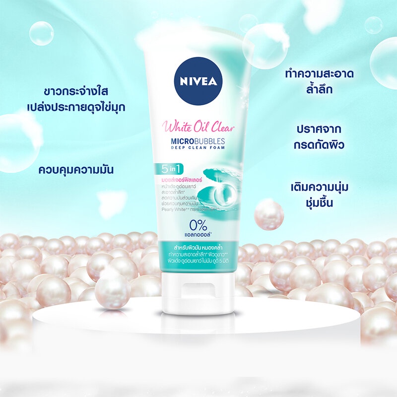 NIVEA Bright Oil Clear Foam 100gโฟมล้างหน้าสูตรควบคุมความมัน ขจัดความหมองคล้ำ และเข้าทำความสะอาดสิ่งสกปรกบนใบหน้าอย่างอ่อนโยนและล้ำลึก อุดมด้วยสารสกัดจากไข่มุกบริสุทธิ์ 90% ผสาน Amino Acid อาหารผิว 16 ชนิดจากสารสกัดไข่มุก และ Pearly White ซึ่งพิสูจน์แล้วว่าให้ประสิทธิภาพความกระจ่างใสเหนือกว่าวิตามินซีถึง 10 เท่า เข้าฟื้นบำรุงผิวหน้าที่หมองคล้ำให้กลับมาดูกระจ่างใสอย่างเป็นธรรมชาติ พร้อมเติมความนุ่ม ชุ่มชื้นสู่ผิว และยังปราศจากกรดกัดผิวที่ทำให้ผิวบาง