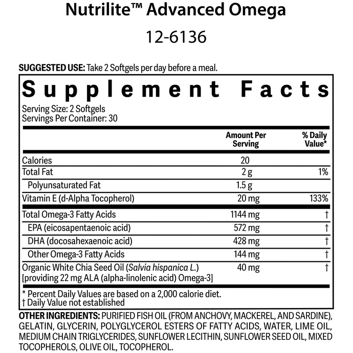 นิวทริไลท์ แอดวานซ์ โอเมก้า (Nutrilite™ Advanced Omega) มาพร้อมประสิทธิภาพการดูดซึมที่เหนือกว่าถึง 3 เท่า* ช่วยให้ร่างกายของคุณนำน้ำมันปลาไปใช้ได้ดีขึ้น เพื่อดูแลสุขภาพสมอง หัวใจ ข้อต่อ ดวงตา และผิวพรรณในทุกๆ วัน เพียงรับประทาน 2 ซอฟต์เจล ซึ่งอ่อนโยนต่อกระเพาะอาหารและลดการเกิดกลิ่นคาวหลังรับประทาน†