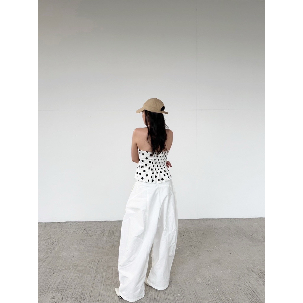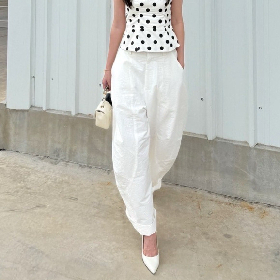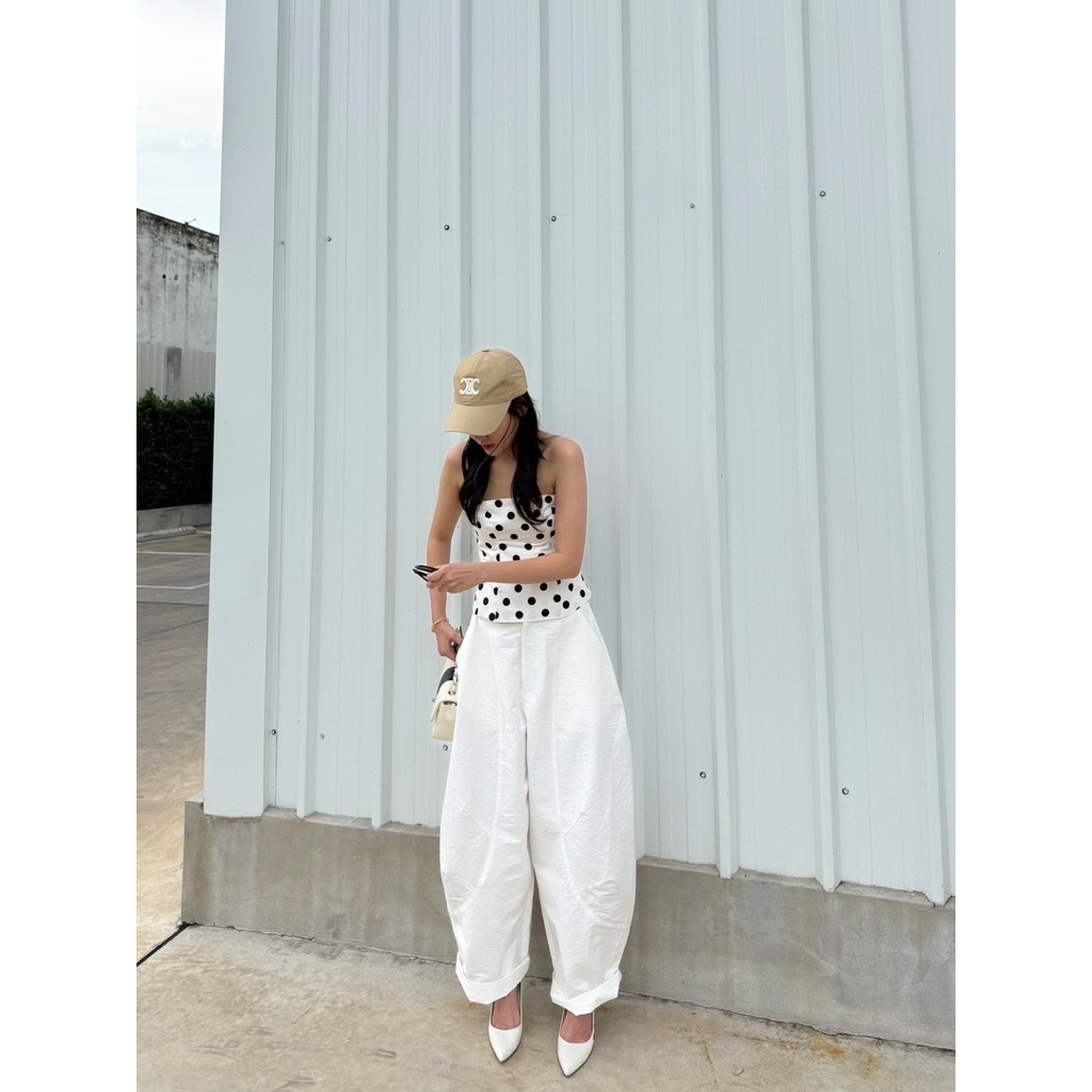กางเกงทรงบอลลูนหรือพองช่วงสะโพกและต้นชา ตัดเย็บด้วยผ้าที่มีเท็กซ์เจอร์เล็กน้อยทรงขากว้างแบบโอเวอร์ไซซ์ ปลายขาพับได้ มีจีบหน้าเนื้อผ้าไม่บาง มีซับในตัวให้ลุคดูมีน้ำหนักช่วยเพิ่มมิติ ให้ลุคดูมีเอกลักษณ์