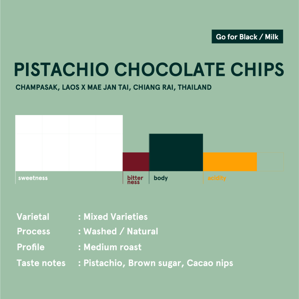 Indulge in the rich and nutty flavors of our Pistachio Chocolate Chips coffee. This blend features a delightful balance of pistachio sweetness with hints of brown sugar and cocoa, perfect for a smooth, medium-roast experience.