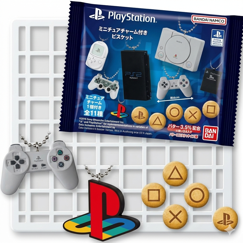 The biscuits are designed to look like the signature PlayStation buttons—the "△〇×□" Shapes Logo and the PlayStation Family Mark. They feature a smooth, delicious butter flavor.