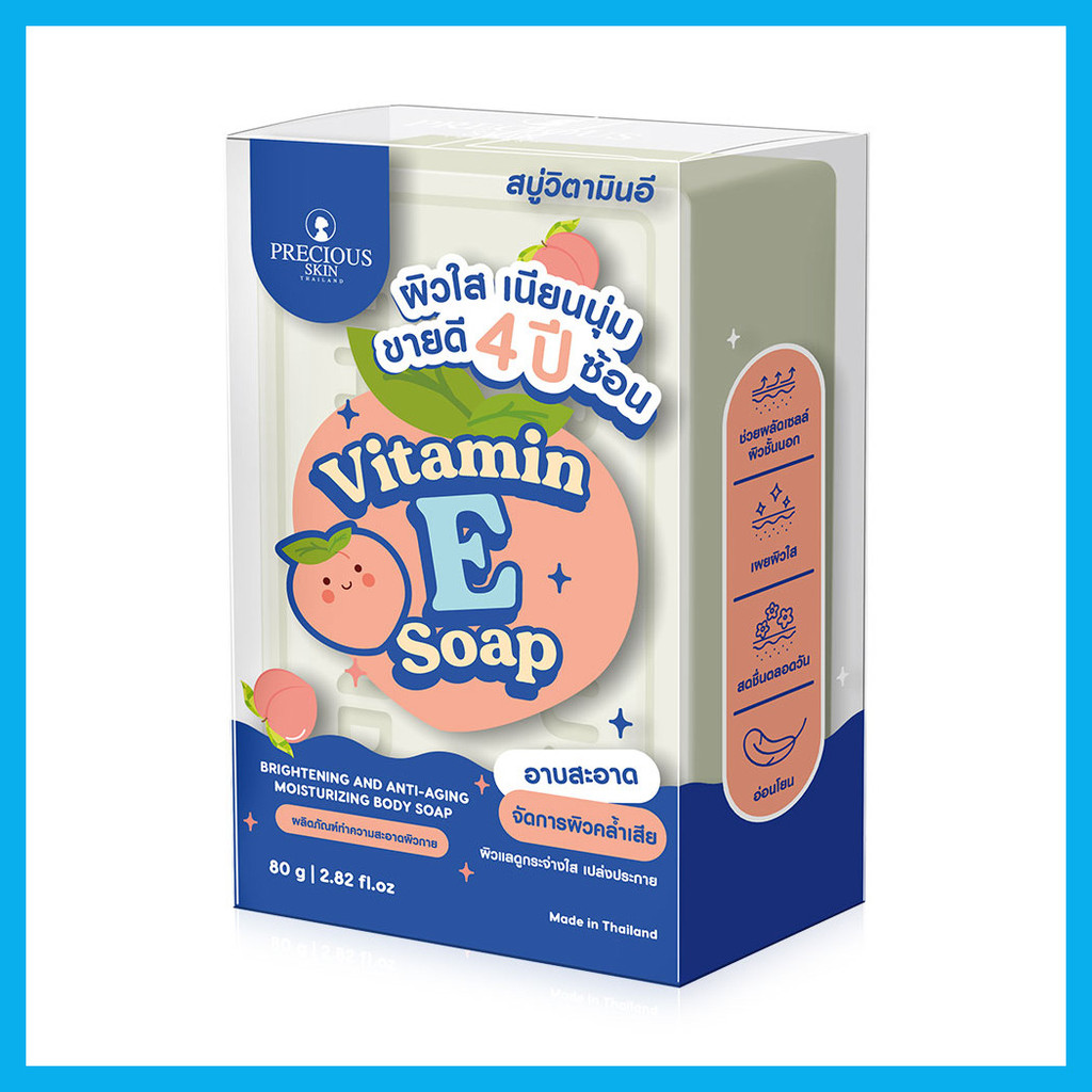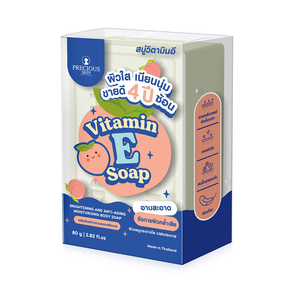 Precious Skin Thailand Vitamin E Soap 80g สบู่ทำความสะอาด ช่วยผลัดเซลล์ผิวอย่างอ่อนโยน ทำให้ผิวกระจ่างใสขึ้น ลดเลือนจุดด่างดำ ริ้วรอย ให้ผิวเนียนนุ่ม น่าสัมผัส
