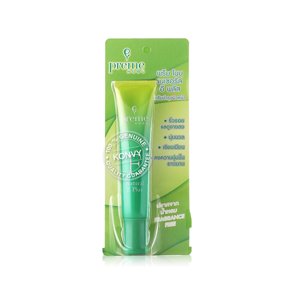 Preme Nobu Natural E Plus 30g ครีมบำรุงผิว เนื้อเซรั่มบางเบา ด้วยคุณค่าจากวิตามินอี สารสกัดโสมเกาหลี และโปรตีนน้ำนม ช่วยให้ริ้วรอยเเลดูจางลง นุ่มนวล เรียบเนียน คงความชุ่มชื้นยาวนาน อีกทั้งยังช่วยลดรอยหมองคล้ำรอบดวงตา พร้อมปกป้องผิวด้วยสารต้านอนุมูลอิสระ