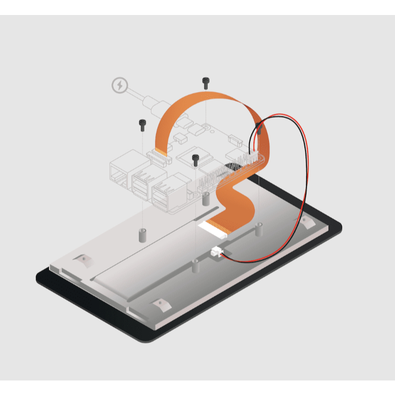 การเชื่อมต่อกับ Raspberry Pi นั้นใช้สายเคเบิลเพียง 2 ชุดเท่านั้น ได้แก่ สายไฟจากพอร์ต GPIO และสายริบบิ้นที่เชื่อมต่อกับพอร์ต DSI บน Raspberry Pi ทุกรุ่น (ยกเว้น Raspberry Pi Zero) หน้าจอสัมผัสรุ่นที่ 2 มาพร้อมกับสาย DSI สองแบบ คือ สายแบบ 15 ถึง 22 พินที่มีรูปทรงพิเศษสำหรับ Raspberry Pi 5 และสายแบบ 15 ถึง 15 พินมาตรฐานสำหรับ Raspberry Pi รุ่นอื่น ๆ