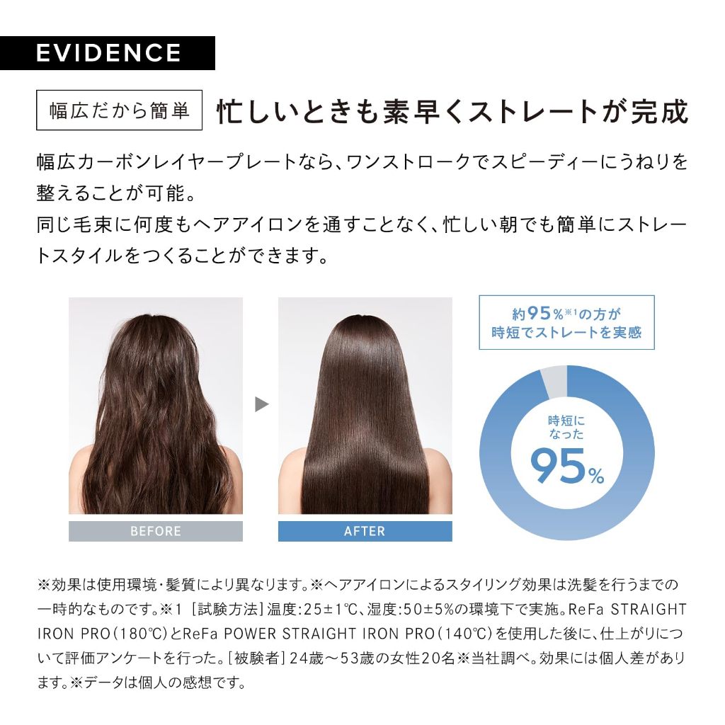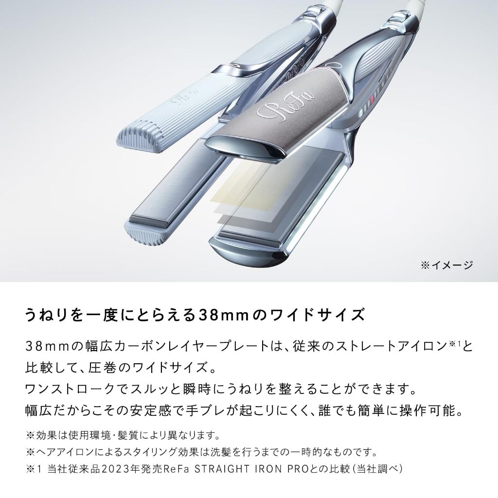 [Turn even unmanageable hair into flawless, lustrous, exceptionally straight*1 hair] The ReFa POWER STRAIGHT IRON PRO tames even the most undulating waves with a single stroke, achieving exceptionally straight hair*1. Its wide 38mm carbon layer plates replicate professional ironing techniques. While minimizing damage from water, heat, and pressure, it creates soft, moisturized hair with a lustrous, 360-degree view. *Effects may vary depending on usage environment and hair type. *1 Compared to our previous model, the ReFa STRAIGHT IRON PRO, released in 2023 (according to our research).