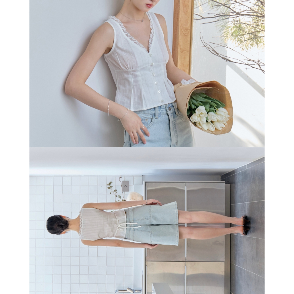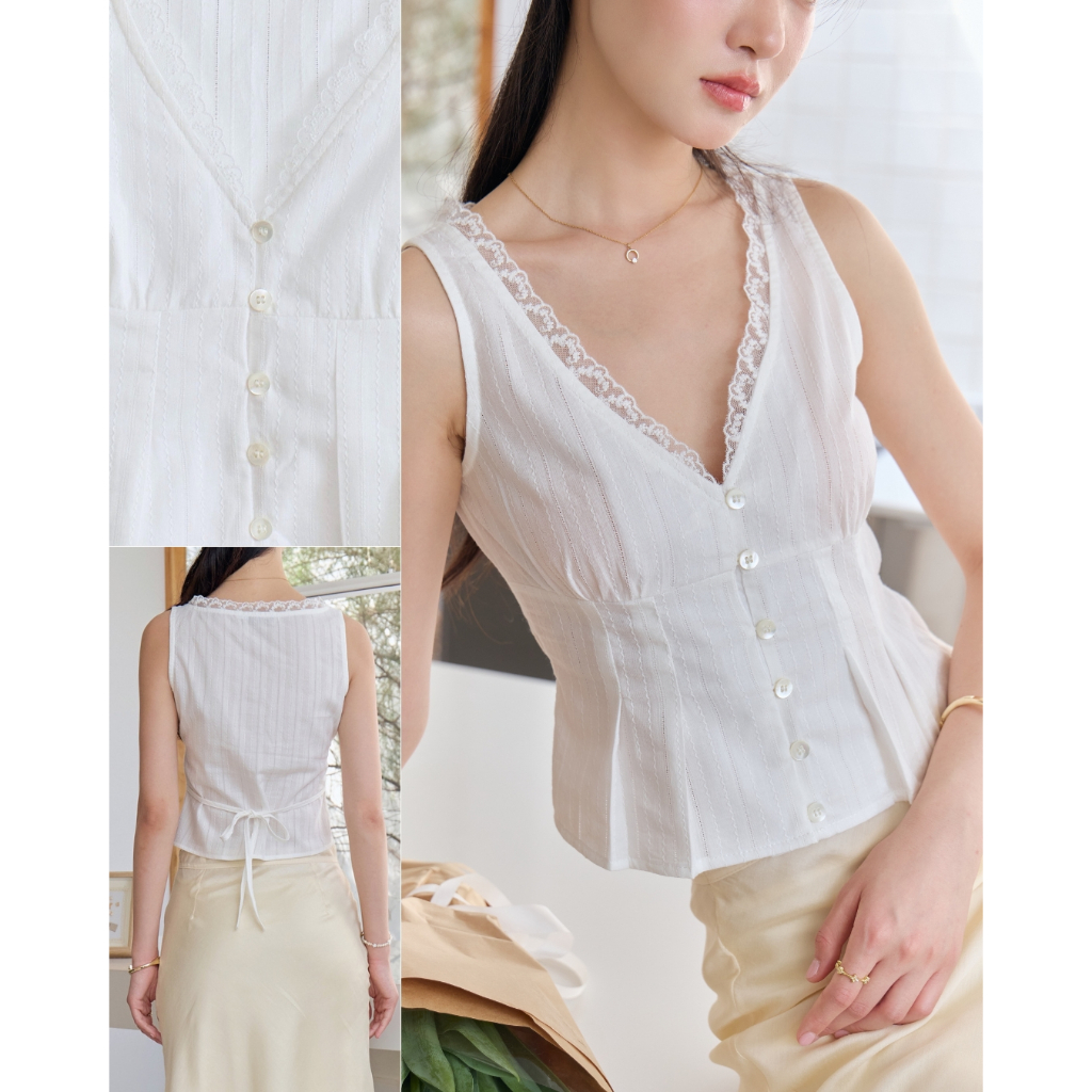 เสื้อ Vest รุ่นใหม่ทรงสวยให้ลุคลูกคุณมาก เนื้อผ้าจะเป็น cotton linen ที่มี texture ฉลุมีลายน่ารักแบบไม่ตะโกน ดีเทลรุ่นนี้จะติดลูกไม้ที่คอเสื้อ และจับจีบที่ตัวเสื้อทำใส่แล้วดูมีทรวดทรงมากยิ่งขึ้น มาพร้อมกับสายเชือกผูกโบว์ด้านหลังได้ด้วย สามารถ styling ได้หลายแบบ ใส่ได้หลายโอกาสแน่นอนค่า