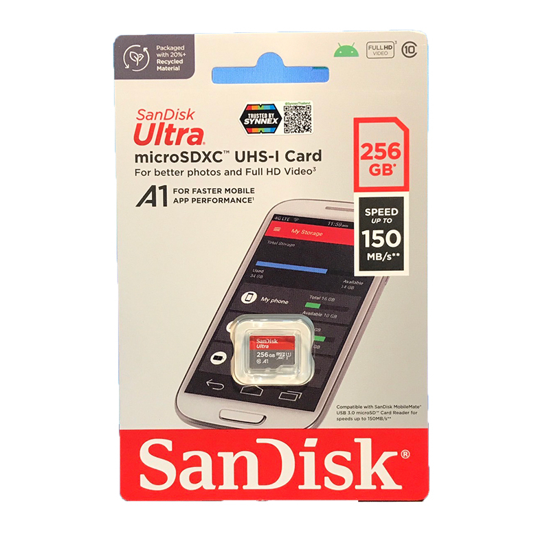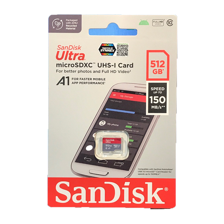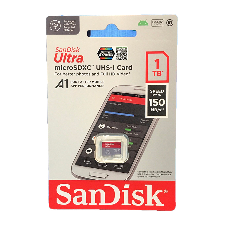 การ์ด SanDisk Ultra® microSDXC™ UHS-I เหมาะสำหรับการบันทึกและดูวิดีโอ Full HD พร้อมพื้นที่การจัดเก็บวิดีโอได้มากกว่าเดิมอีกหลายชั่วโมง ความเร็วในการถ่ายโอนสูงถึง 150MB/วินาที** ให้คุณสามารถย้ายเนื้อหาทั้งหมดของคุณได้รวดเร็วทันใจดุจสายฟ้า การ์ดนี้ได้รับการจัดอันดับ A1 ซึ่งหมายความว่าคุณสามารถโหลดแอปได้รวดเร็วยิ่งขึ้นเช่นกัน เหมาะสำหรับสมาร์ทโฟนและแท็บเล็ตระบบ Android™1