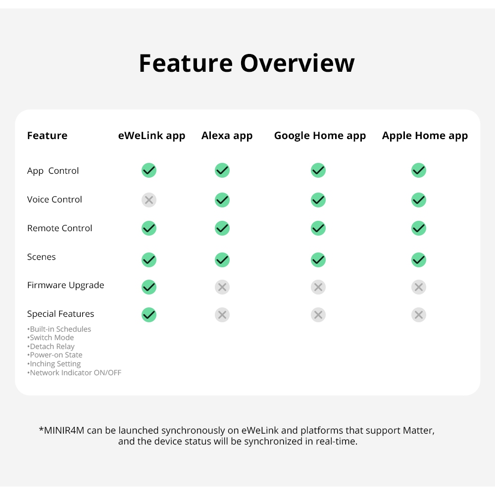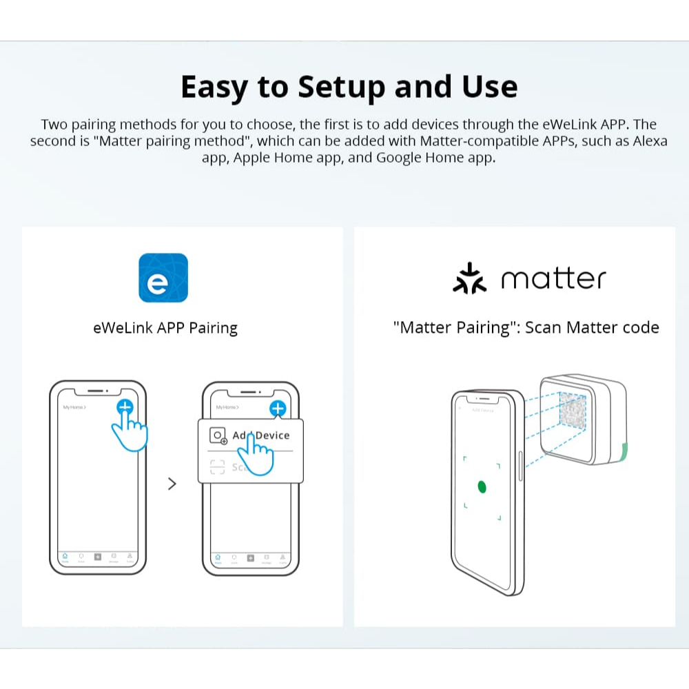 【Matter Compatible】SONOFF MINIR4M is a Matter-certified device, it can work with other brands of Matter end devices and integrate into Matter-enabled platforms, such as Alexa, Apple Home, Google Home, etc. Controlling all smart devices through one app is no longer a fantasy.