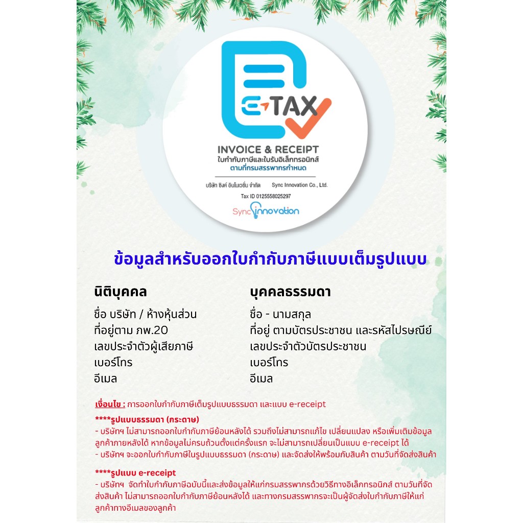 - บริษัทฯ จัดทำใบกำกับภาษีฉบับนี้และส่งข้อมูลให้แก่กรมสรรพากรด้วยวิธีทางอิเล็กทรอนิกส์ ตามวันที่จัดส่งสินค้า ไม่สามารถออกใบกำกับภาษีย้อนหลังได้ และทางกรมสรรพากรจะเป็นผู้จัดส่งใบกำกับภาษีให้แก่ลูกค้าทางอีเมลของลูกค้า