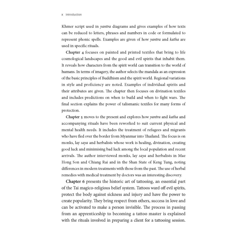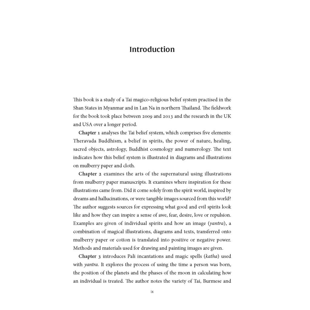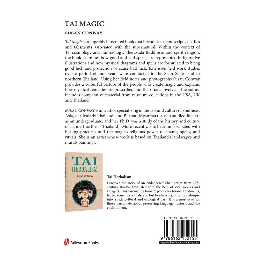 Tai Magic is a superbly illustrated book that introduces manuscripts, textiles and talisments associated with the supernatural. Within the context of Tai cosmology and numerology, Theravada Buddhism and spirit religion, the book examines how good and bad spirits are represented in figurative illustrations and how mystical diagrams and spells are formulated to bring good luck and protection or cause bad luck. Extensive field work studies over a period of four years were conducted in the Shan States and in northern Thailand. Using her field notes and photographs Susan Conway provides a colourful picture of the people who create magic and explains how mystical remedies are prescribed and the rituals involved. The author includes comparative material from museum collections in the USA, UK and Thailand.