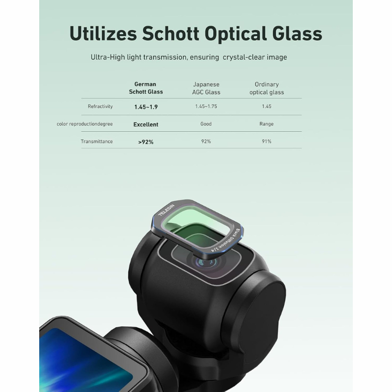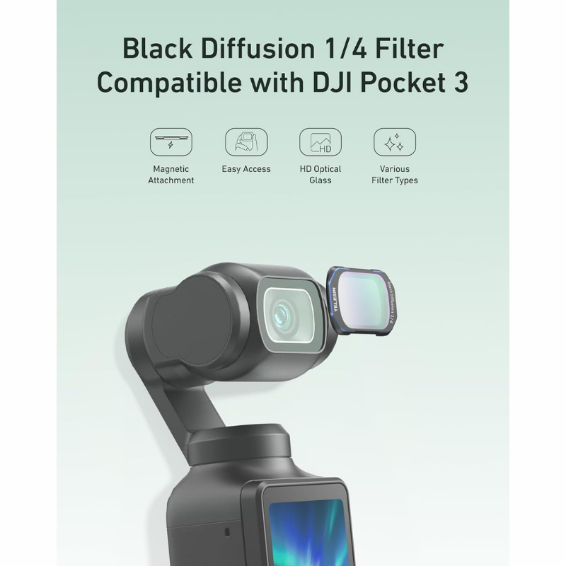 -This 1/4 black diffuser filter for Osmo Pocket 3 uses imported AGC + high light transmittance optical glass lens, accurately restores the true color of the scene, and shows more natural details. Magnetic design, quick installation and removal, the ultra-thin lens completely avoids the problem of original filter sticking.