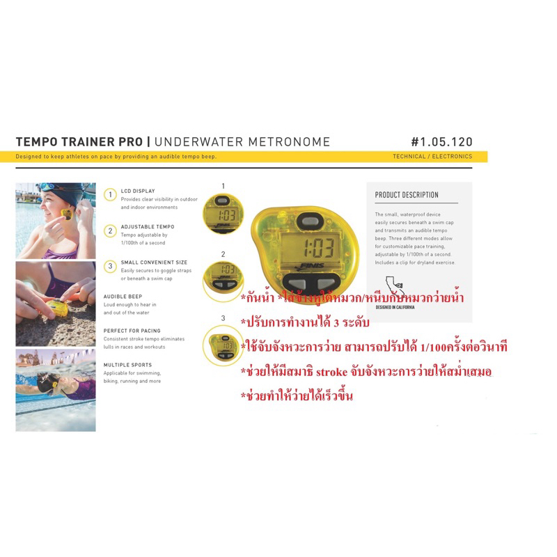 อุปกรณ์กันน้ำขนาดเล็กนี้ติดไว้ใต้หมวกว่ายน้ำได้อย่างง่ายดายและส่งเสียงบี๊บบอกจังหวะการเต้นที่ได้ยินได้ จังหวะการเต้นที่ปรับได้ช่วยให้สามารถระบุและรักษาจังหวะการเต้นที่เหมาะสมได้ ขณะนี้ Tempo Trainer Pro มีตัวเลือกในการเปลี่ยนแบตเตอรี่ จึงใช้งานได้นานหลายอายุการใช้งาน โหมดการฝึกสามโหมดที่แตกต่างกันช่วยให้คุณปรับแต่งได้ตามความต้องการ Tempo Trainer Pro มีคลิปสำหรับการออกกำลังกายบนบก