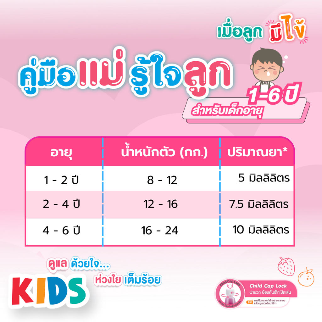 ยาลดไข้สำหรับเด็กอายุ 1-6ปี มีตัวยาพาราเซตามอล ชนิดน้ำเชื่อมใส ด้วยตัวยารสชาติหวาน รับประทานง่าย ไม่มีตะกอน ได้รับตัวยาเต็มที่เท่ากันทุกหยด