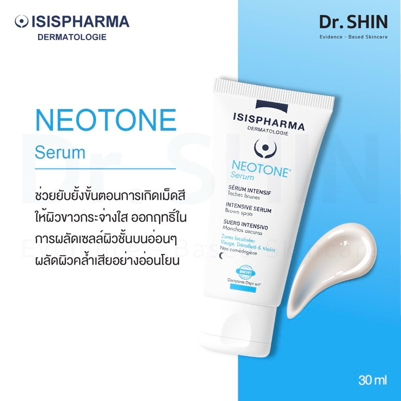 NEOTONE Serum เซรั่มสูตรเข้มข้น ด้วยนวัตกรรม Depi-act Complexe ที่ช่วยให้ผิวกระจ่างใส และให้ผิวชุ่มชื้นขึ้นอีกด้วย โดยมีส่วนประกอบหลักของ depi act 4ตัว เรียกรวมว่า depi-act complex ซึ่งเป็นสารให้ความกระจ่างใส มี wny inhibitor, niacenamide,licorice เกรด ที่มี galberdin 95 (ปกติทั่วไปในตลาดมีแค่40) และ lumiskin ที่เป็นส่วนประกอบสำคัญใน neotone ตัวเก่า เนื้อเซรั่มบางเบาเหมือนเดิม แต่เพิ่มความเข้มข้นขึ้น เพิ่มปริมาณส่วนผสมของ Glycolic acid 6% และ Salicylic acid 0.5% เพื่อช่วยเพิ่มการผลัดเซลล์ผิว ทำใผิวหน้ากระจ่างใส