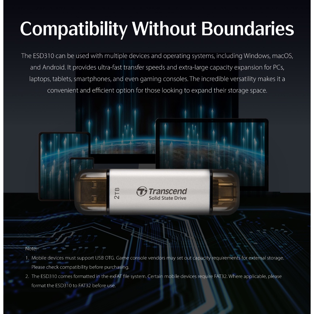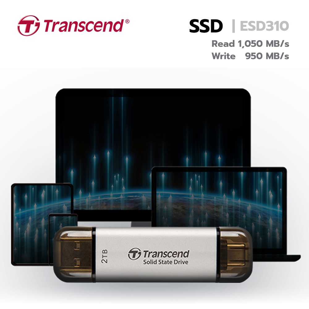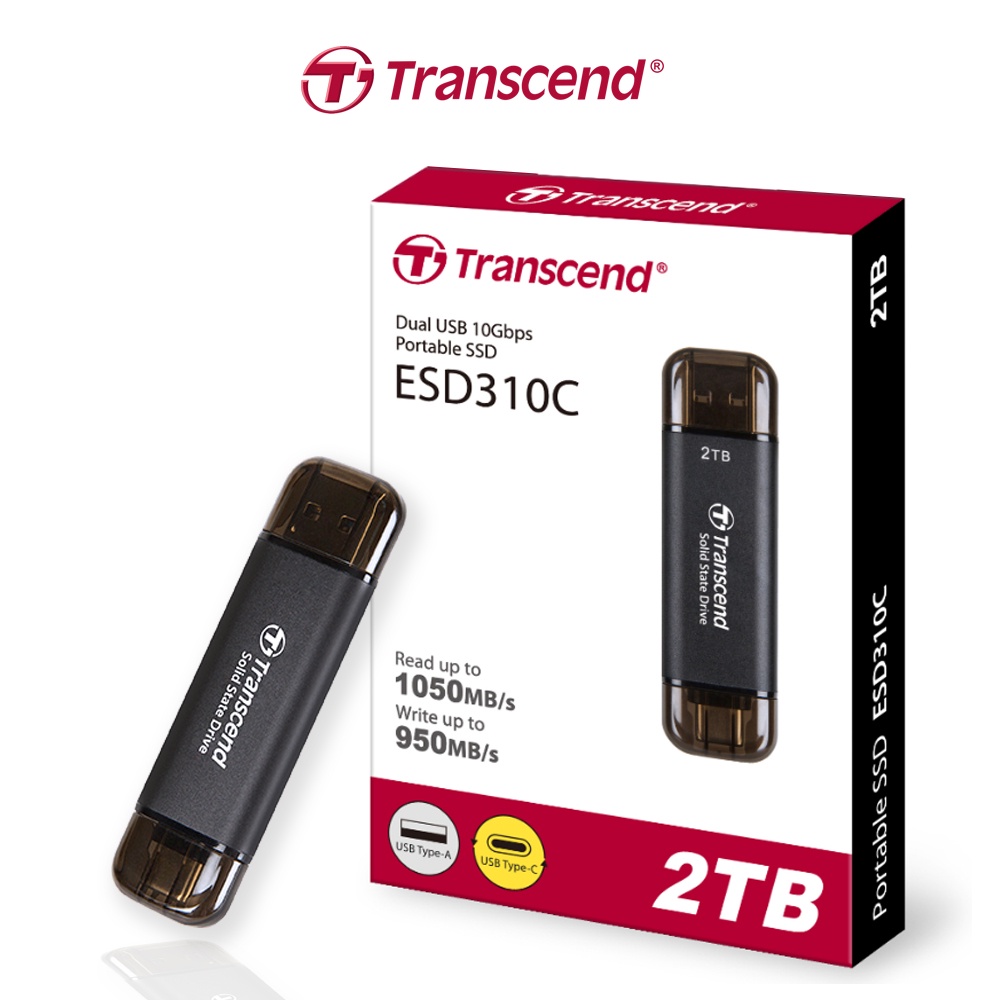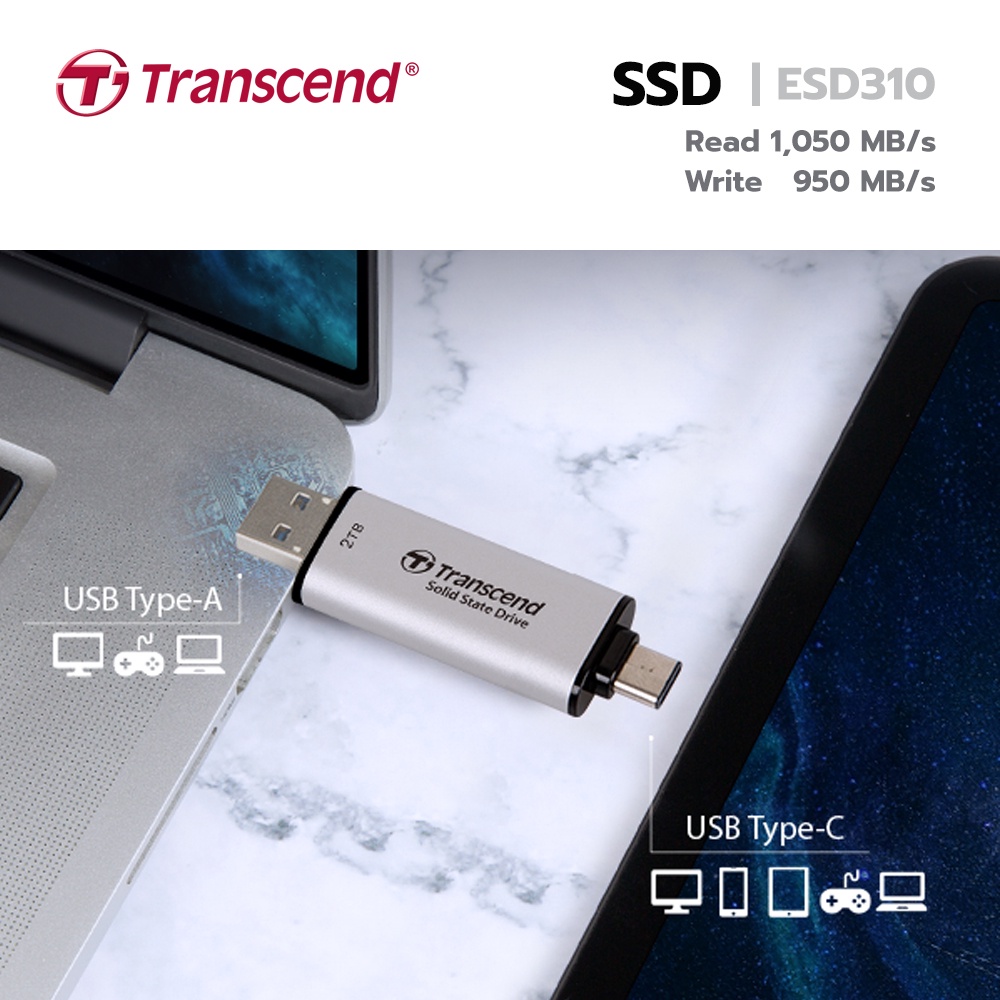 สำหรับ Transcend External SSD smallest : ESD310C นี้เป็น SSD พกพาขนาดเล็กที่สุด ที่มีความจุ 512GB, 1TB และ 2TB ซึ่งเหมาะสำหรับคนที่ต้องใช้งานเครื่องคอมพิวเตอร์หลายเครื่อง หรือต้องการพกพาข้อมูลไปทำงานนอกสถานที่ ซึ่งพัฒนามาจากเทคโนโลยี USB Type A และ USB Type C connectors ทำให้สามารถใช้กับเครื่องคอมพิวเตอร์ในทุกสภาพแวดล้อมได้