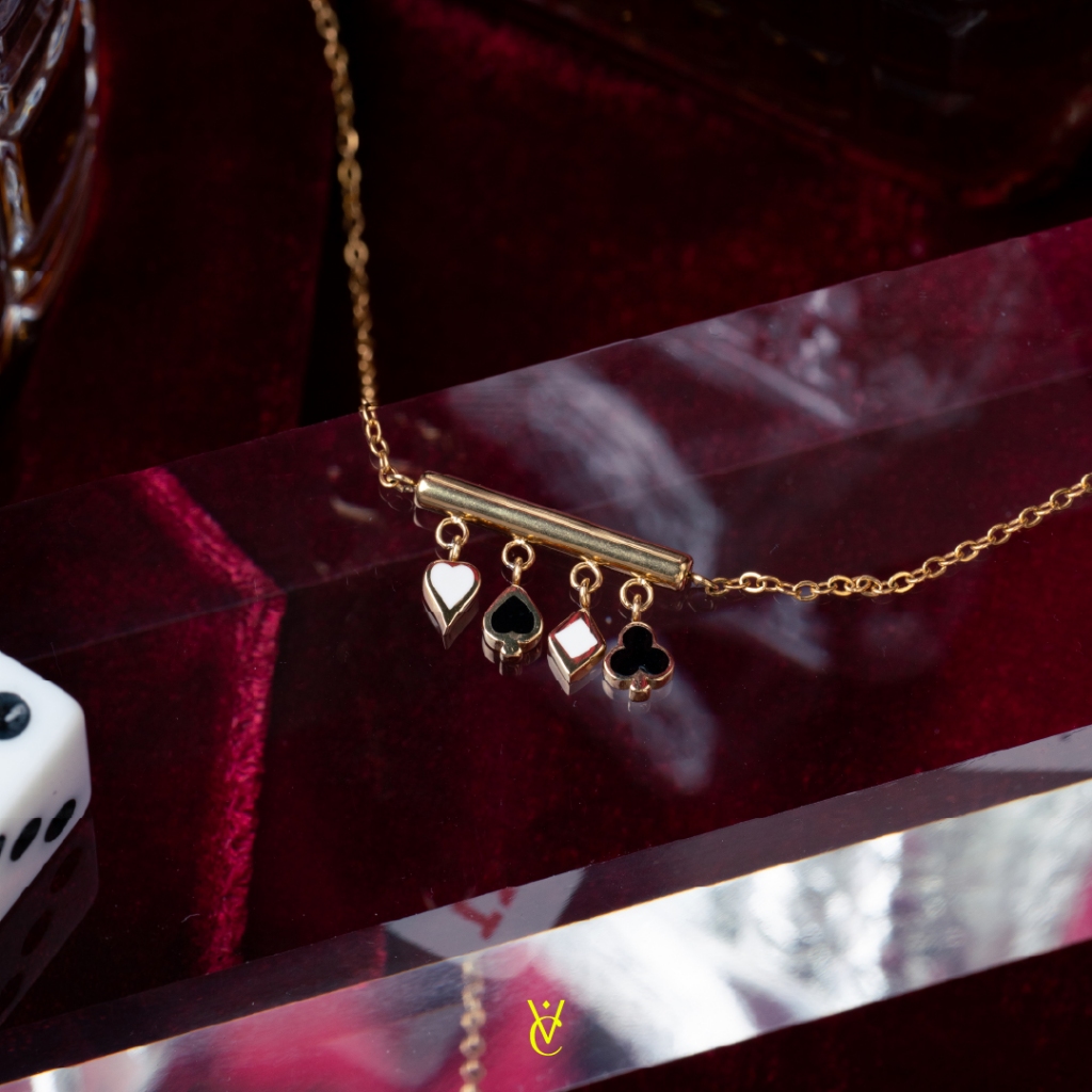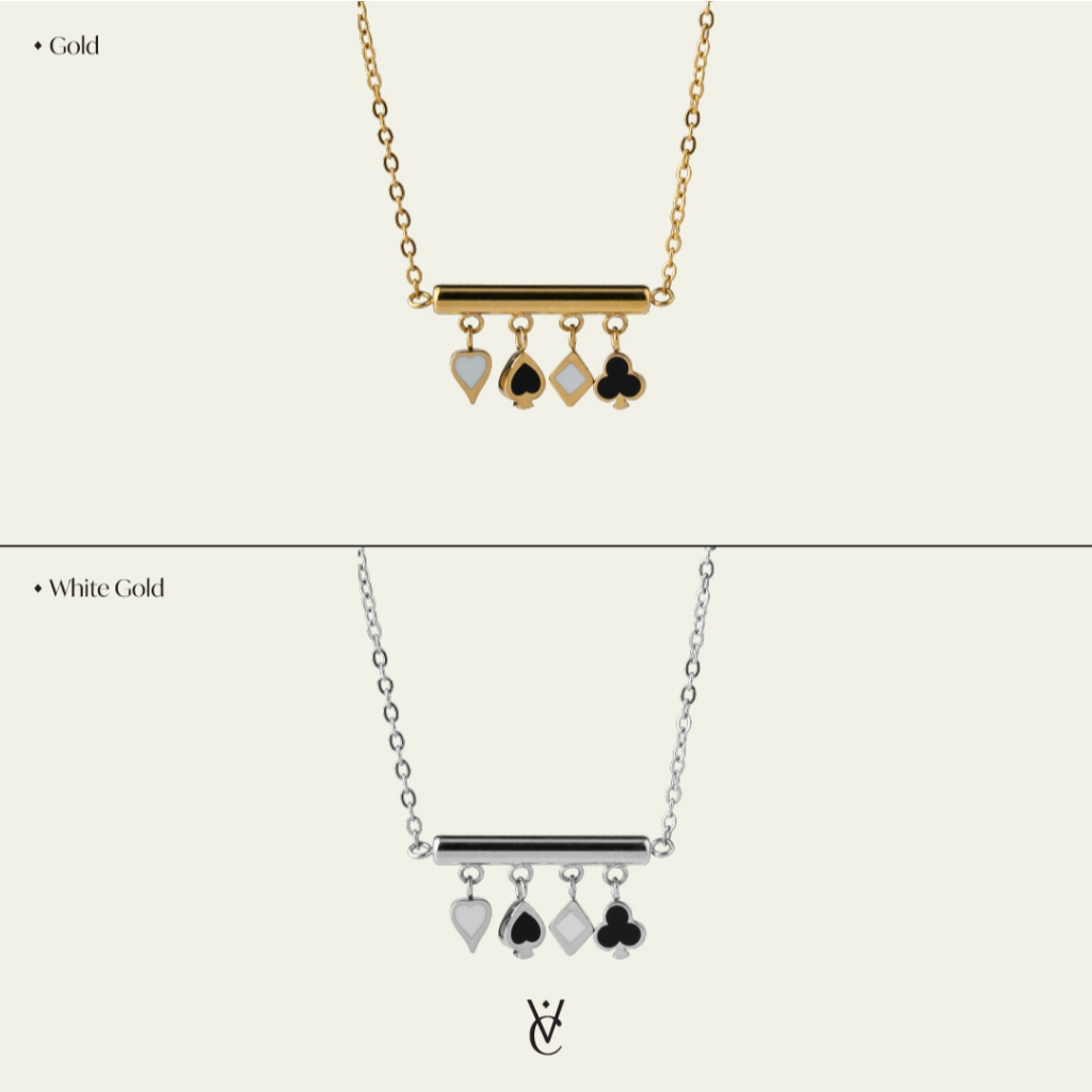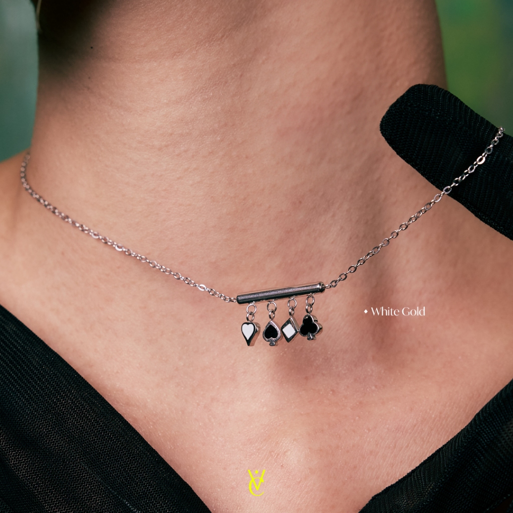 ♠️ Lucky Bao Suit Necklace Gold/ White Gold (Length 40+5 cm - 1490.-) สร้อยคอดีไซน์สัญลักษณ์บนไพ่ทั้ง 4 ตัวห้อยเป็นจี้เรียงกัน เส้นนี้เก๋มาก ใครหาสร้อย Lucky Charm ใส่ติดตัวอยู่ เส้นนี้ต้องมีค่ะ